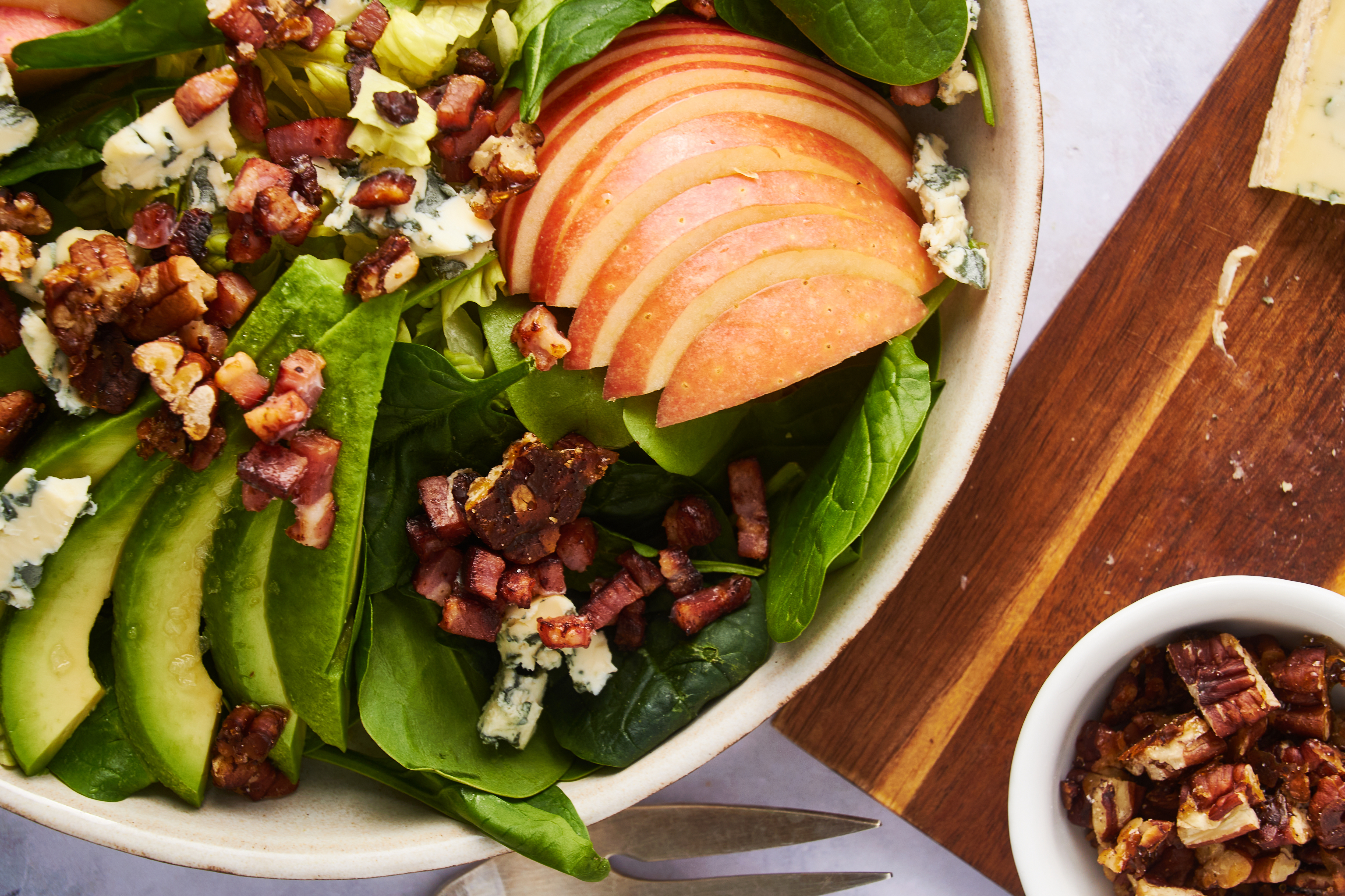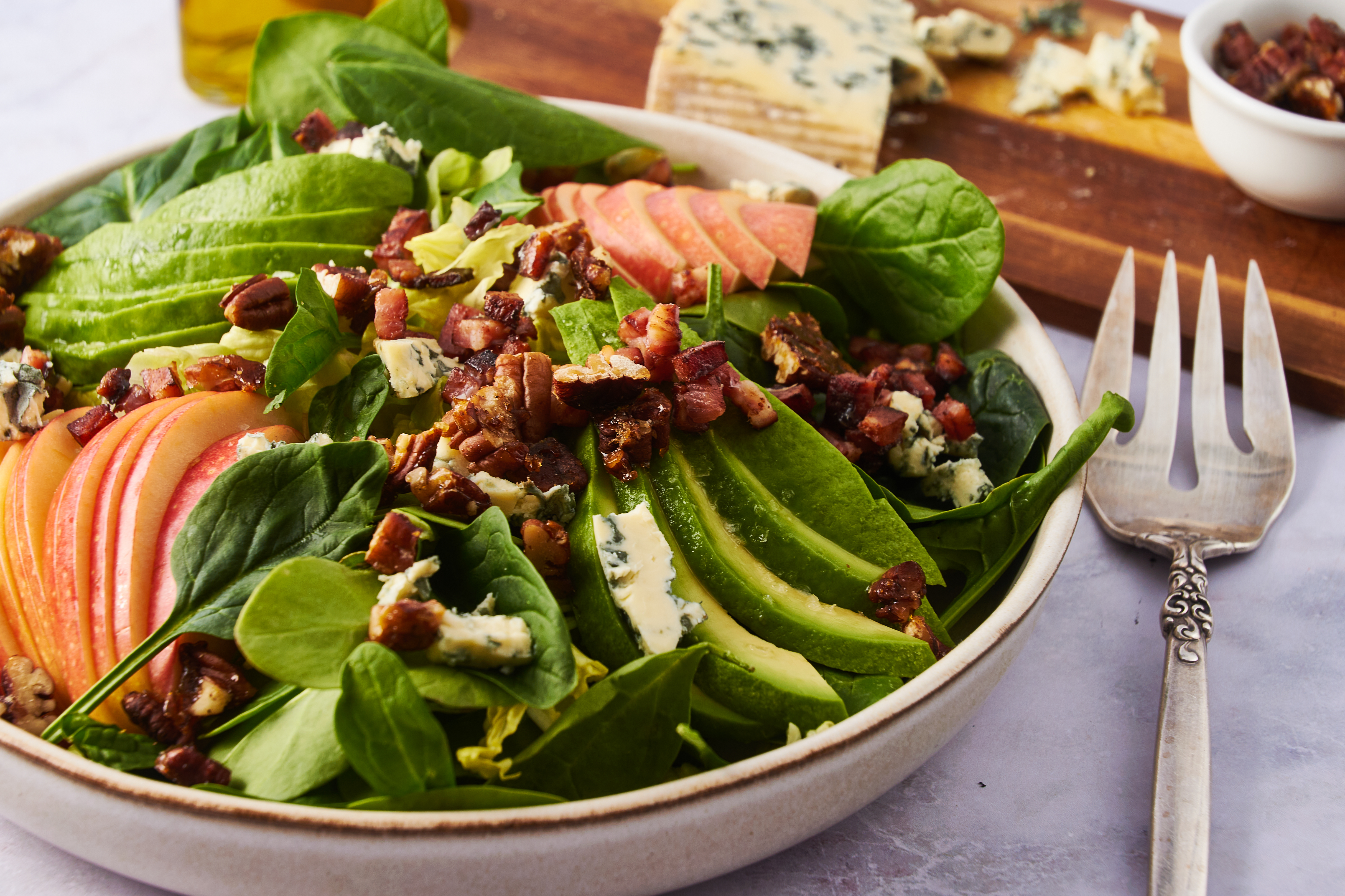 While the name is inviting all on its own, Apple and Pecan Spinach Salad has far more going on than the name suggests! First of all, those aren't just any ordinary pecans, but candied pecans, bringing out their natural sweetness and buttery flavor and making them just a delight to crunch! Then there's the tangy, syrupy balsamic dressing making sure everything is looking and tasting its finest on the plate! Oh, and the crispy, succulent bacon bits, because who can say no to that? Even outside all that, the apples are crisp, the blue cheese enticing, and the spinach fresh! The more you dig into it, the more Apple and Pecan Spinach Salad amazes!