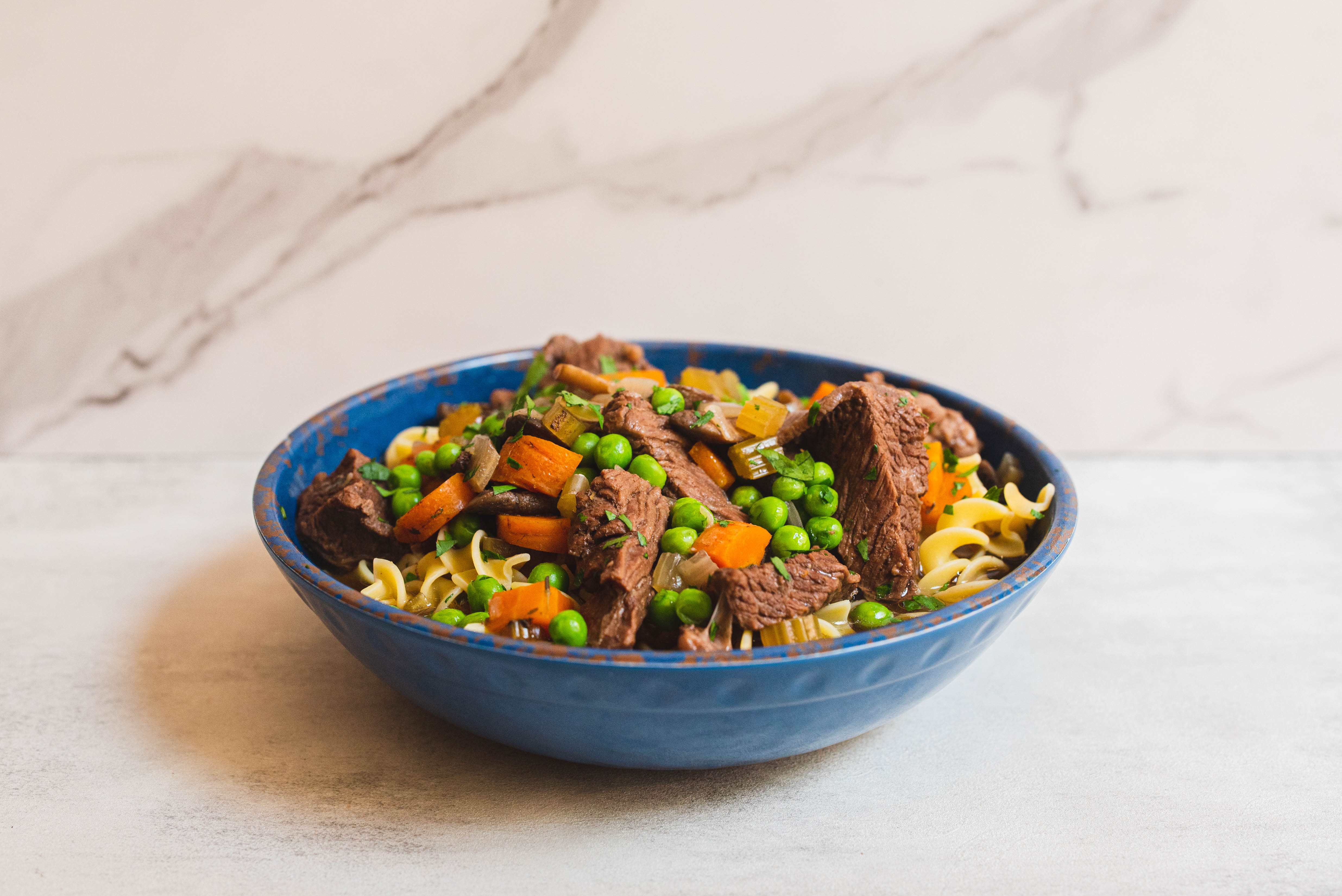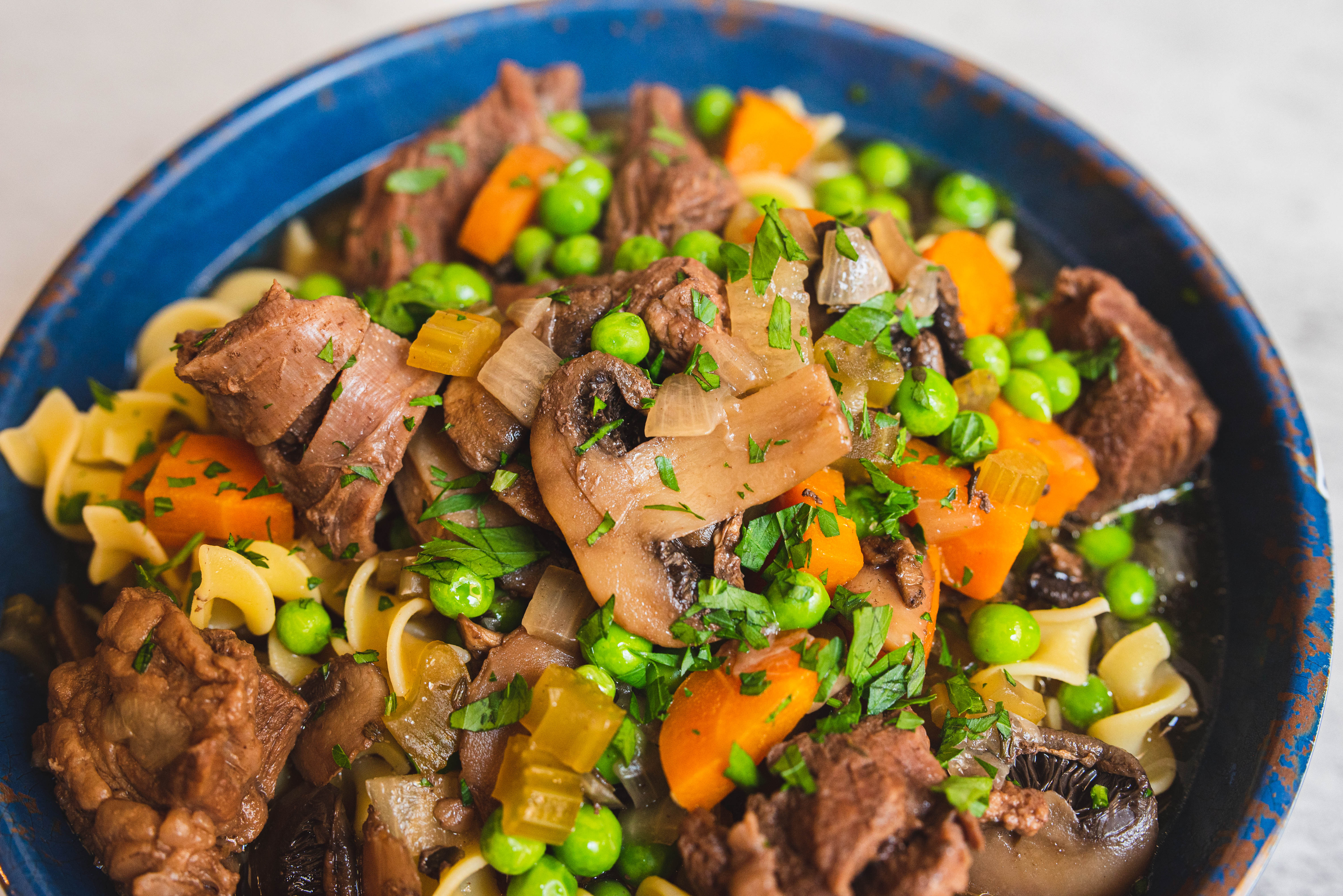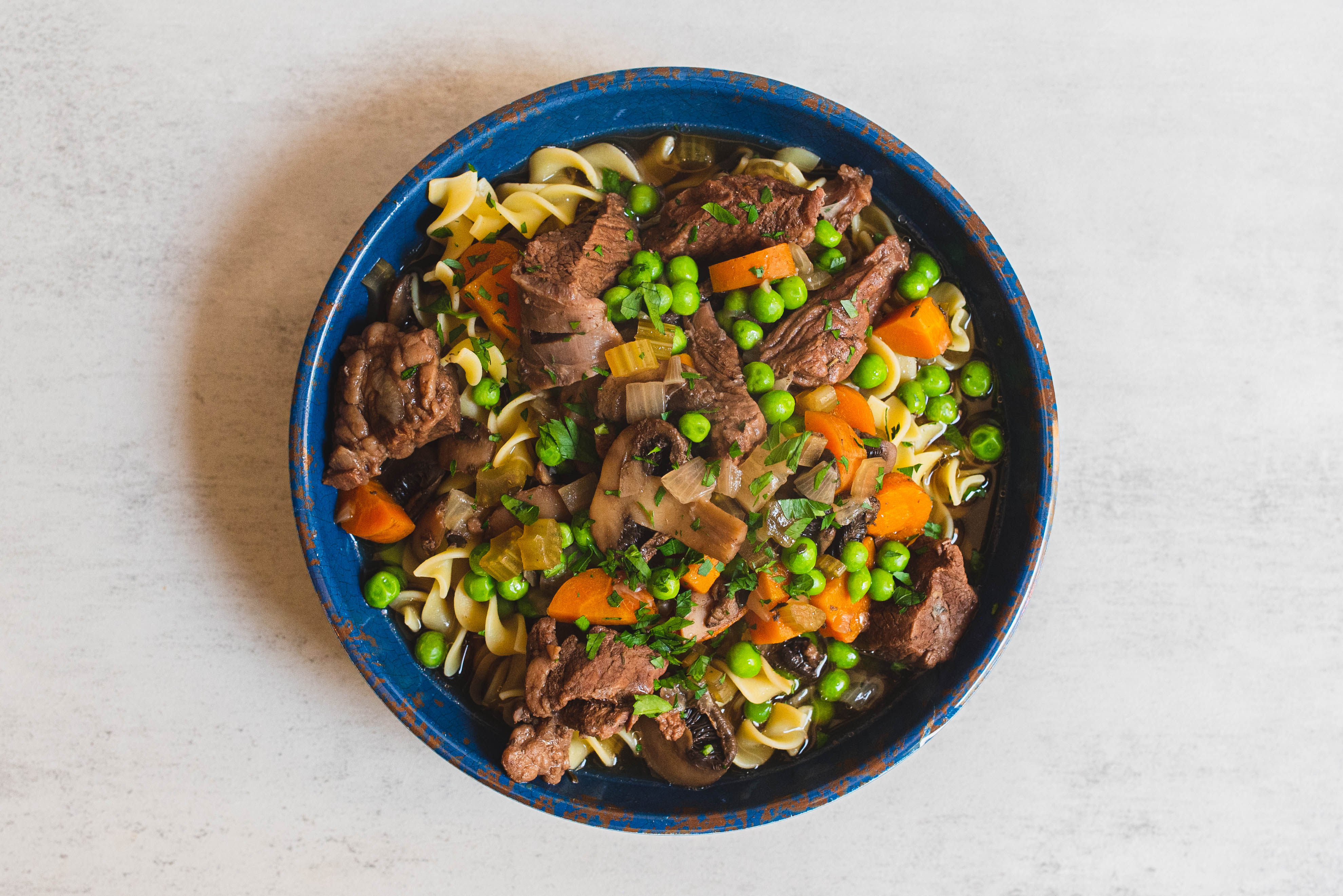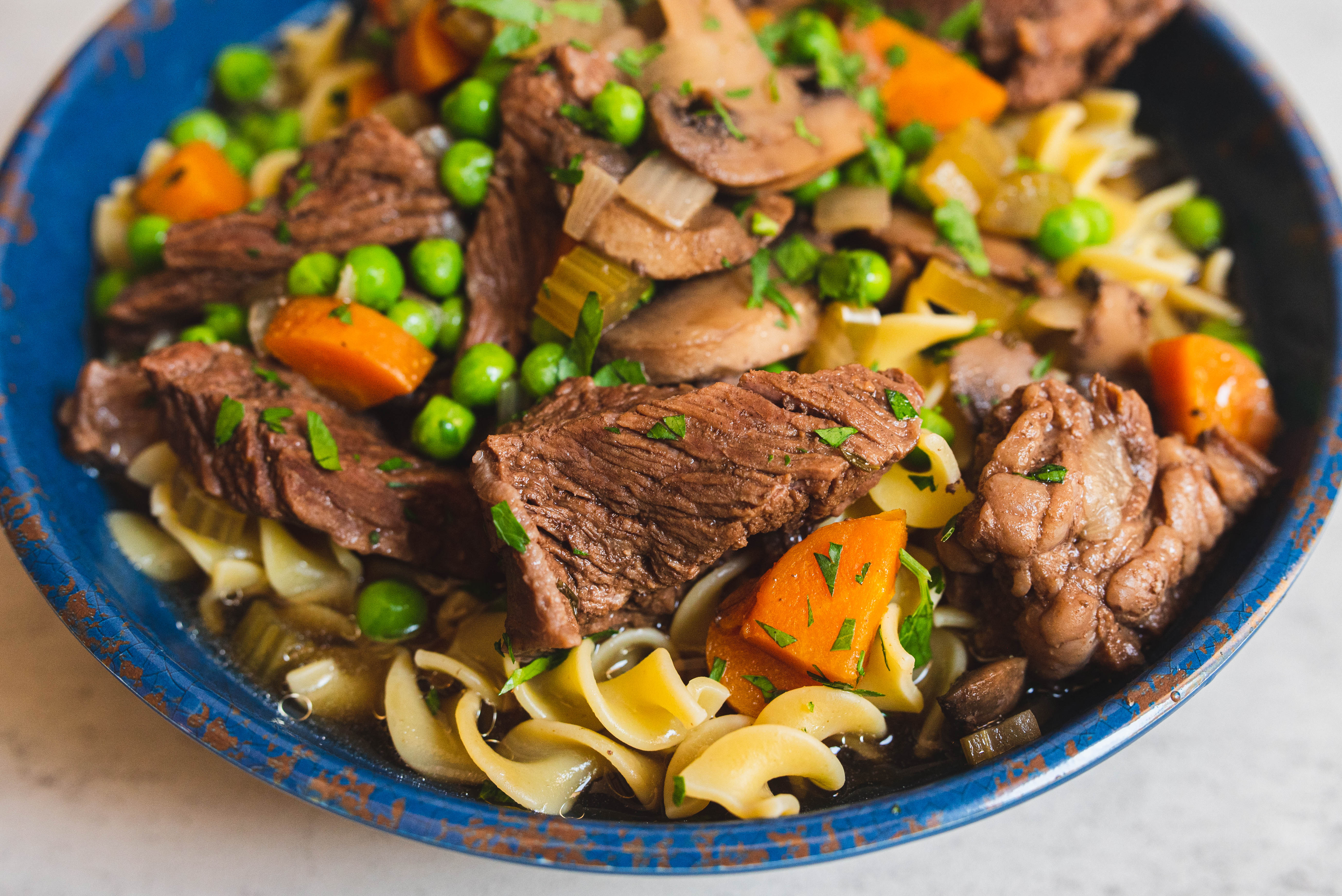 Chicken noodle soup is good for when you are feeling down, but Beef Noodle Soup is an even heartier dish that will definitely help ensure things start looking up! It's filled with tender tangles of egg noodles and plenty of bright, fresh garden vegetables, wonderful pairings for the juicy cubes of beef and the golden-brown sautéed mushrooms! When you feel a sniffle coming on, Beef Noodle Soup will help you feel right as rain!