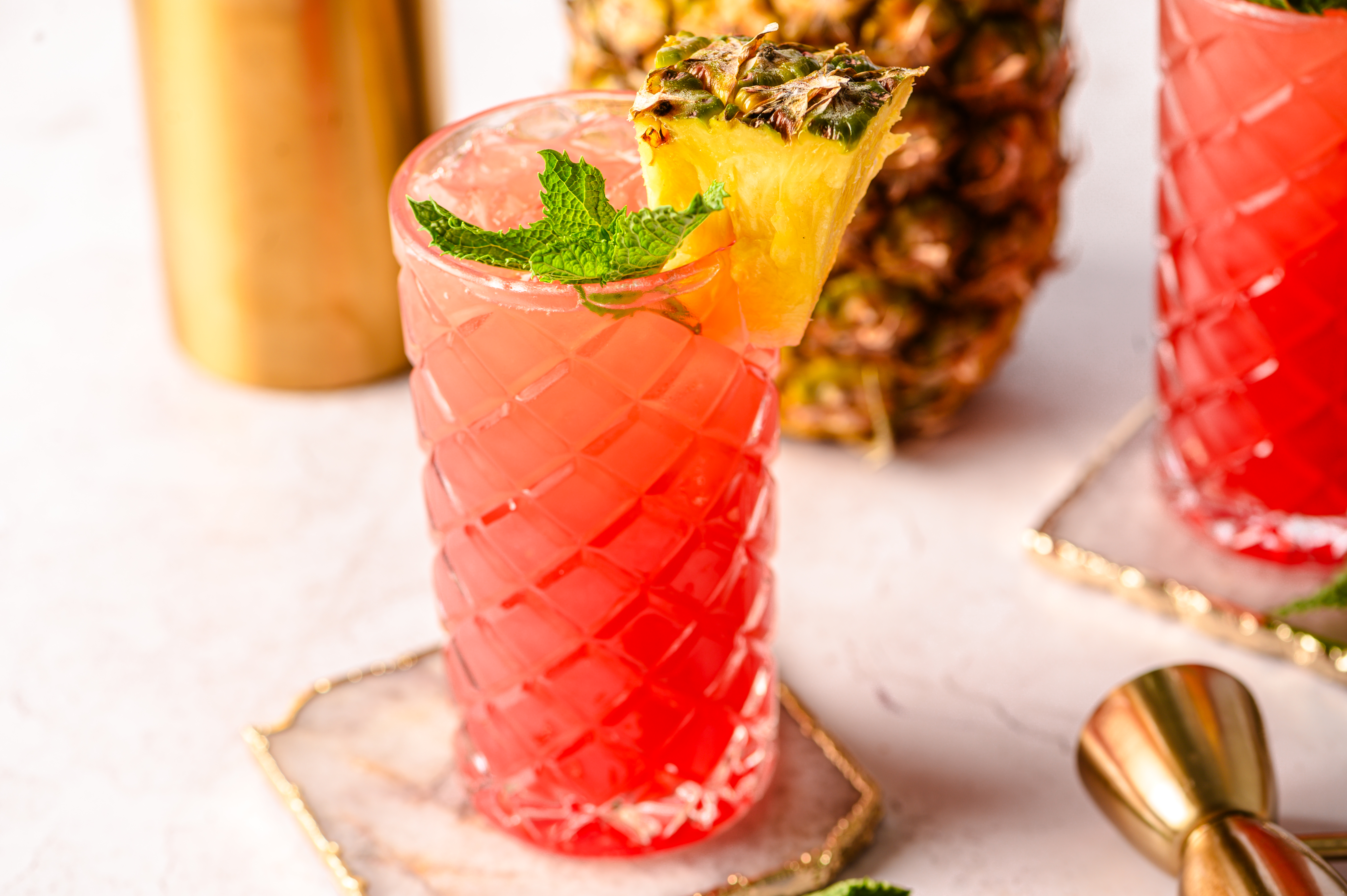 Ahoy, matey! We found a buried treasure that will get you hooked! Land ho, we know you will quickly dock yourself next to this tall glass of Boozy Pirate Punch! Yo-ho-ho and a bottle of rum (really just a couple ounces of tropical coconut rum, regular rum, and sweet banana liqueur) is the tune to this swashbuckling beverage sailing the high seas of crisp cranberry with passionate, golden waves of pineapple juices. Don't go overboard or lose your sea legs from this Boozy Pirate Punch, or you'll be walking the plank for sure!