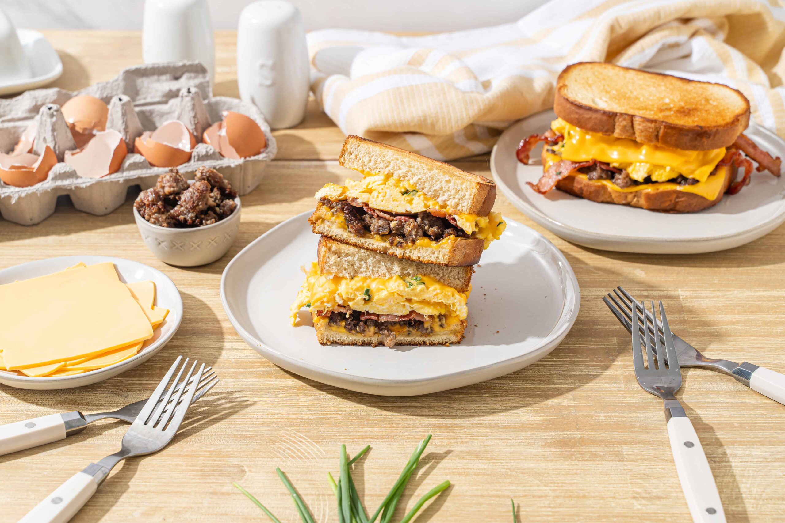 • Flip the slices over and top them each with the cheese, the sausage, the bacon, the eggs, the chives, the sriracha, and the remaining bread slices, spreading the butter over top each slice.