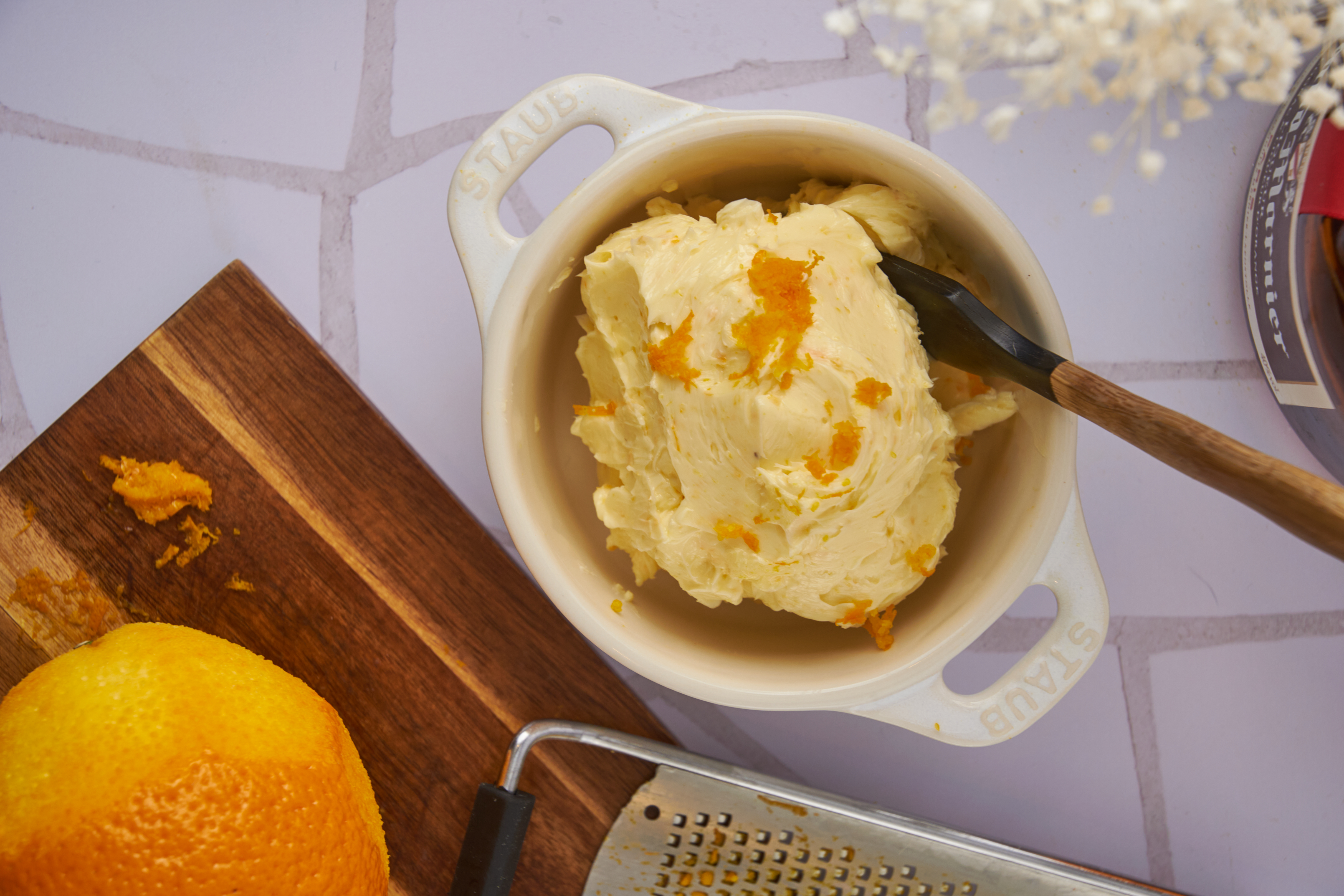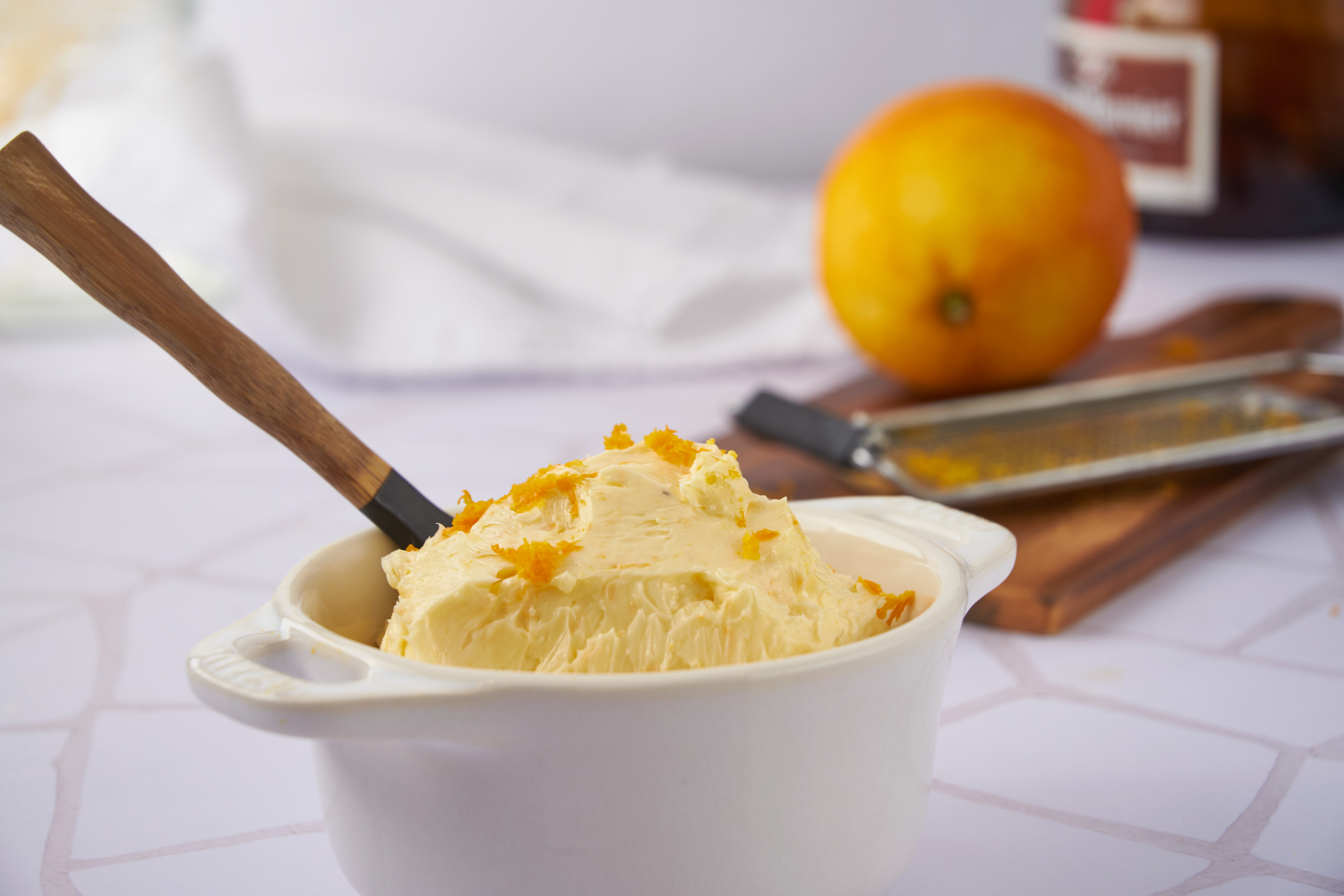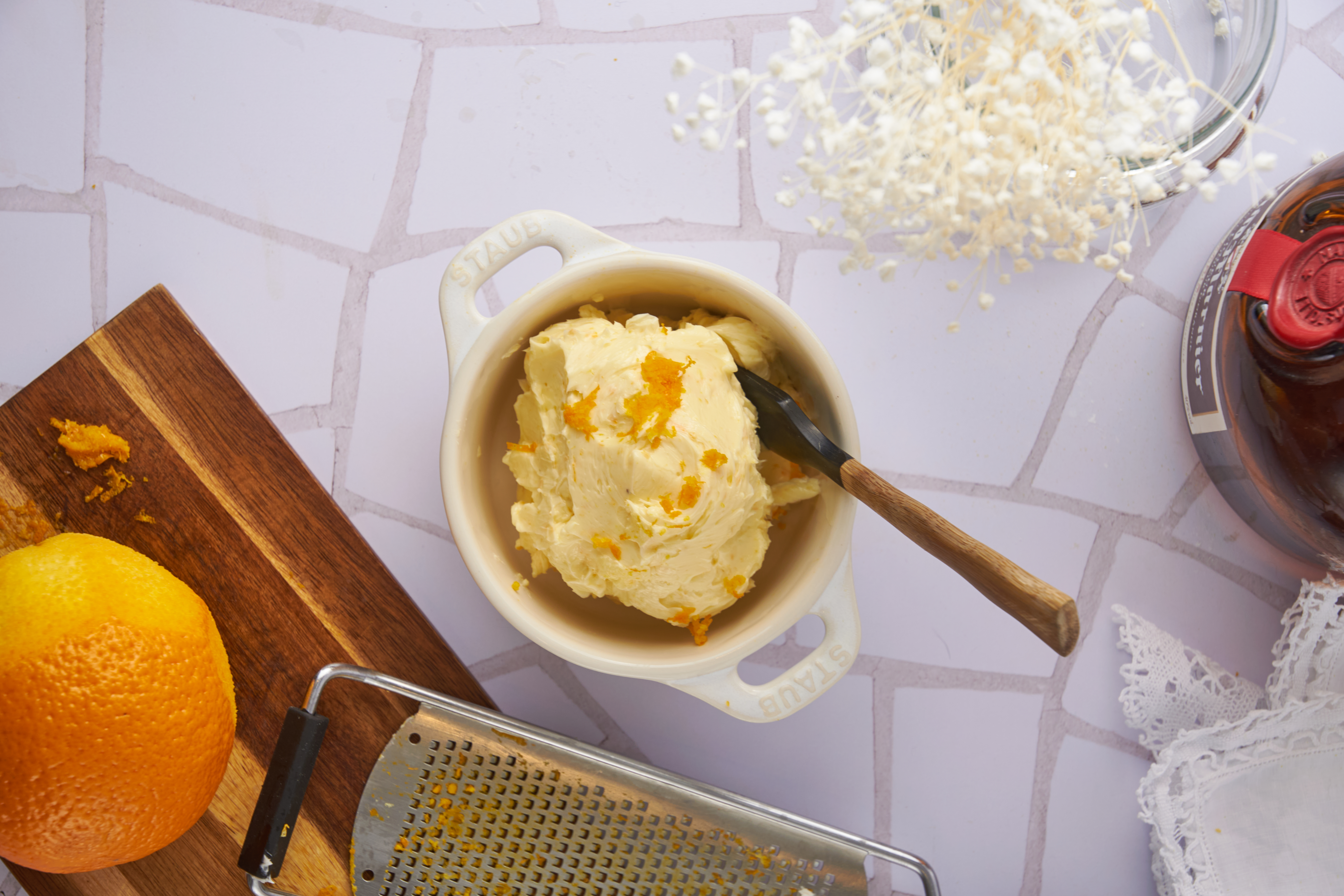 Step 1 -In a medium bowl with a stand mixer, add the butter, the Grand Marnier, and the orange zest and mix until smooth and well-combined.