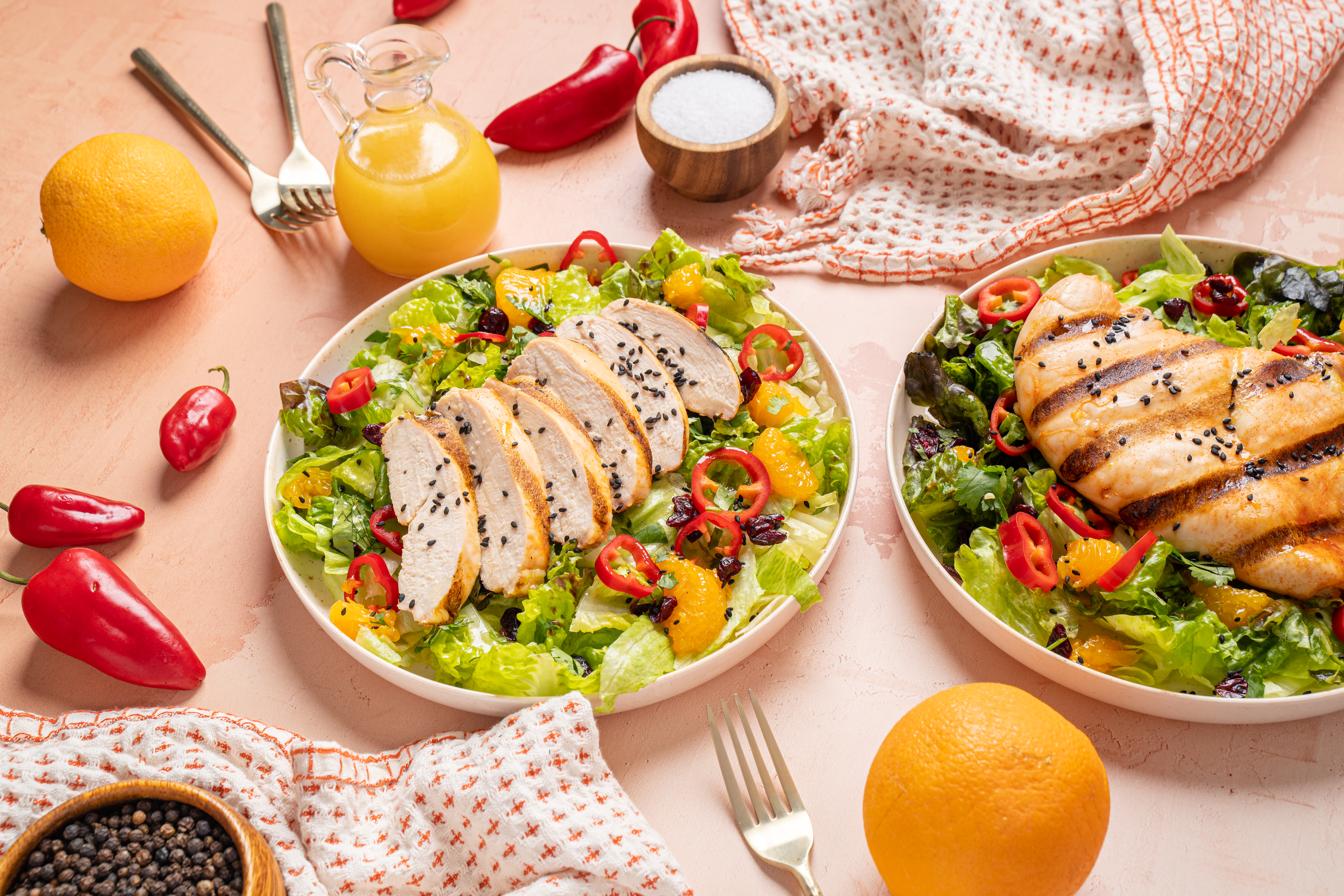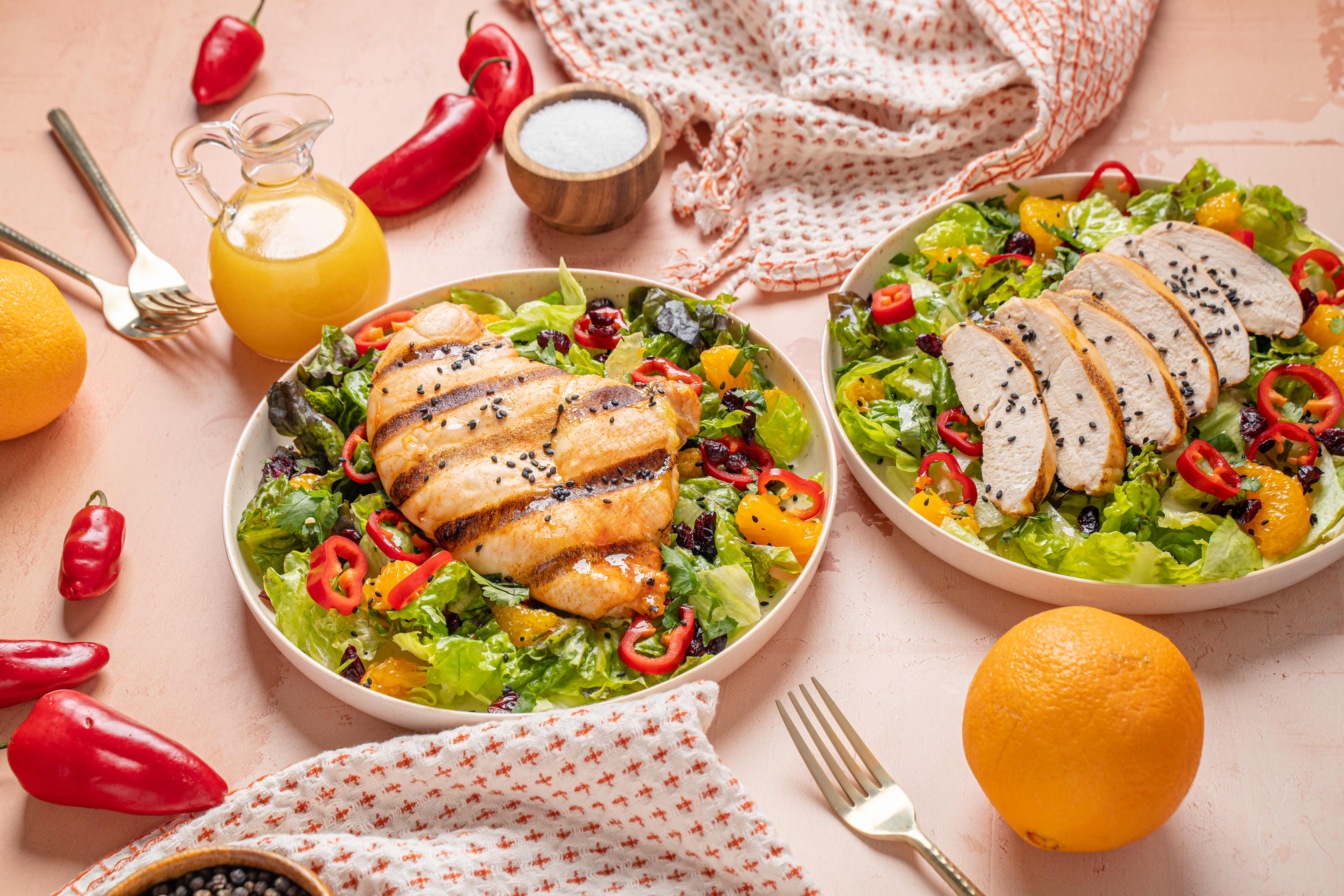 Step 5 -Top the lettuce with the grilled chicken, the mandarin oranges, the bell pepper, the green onions, the cilantro, and the dried cherries.