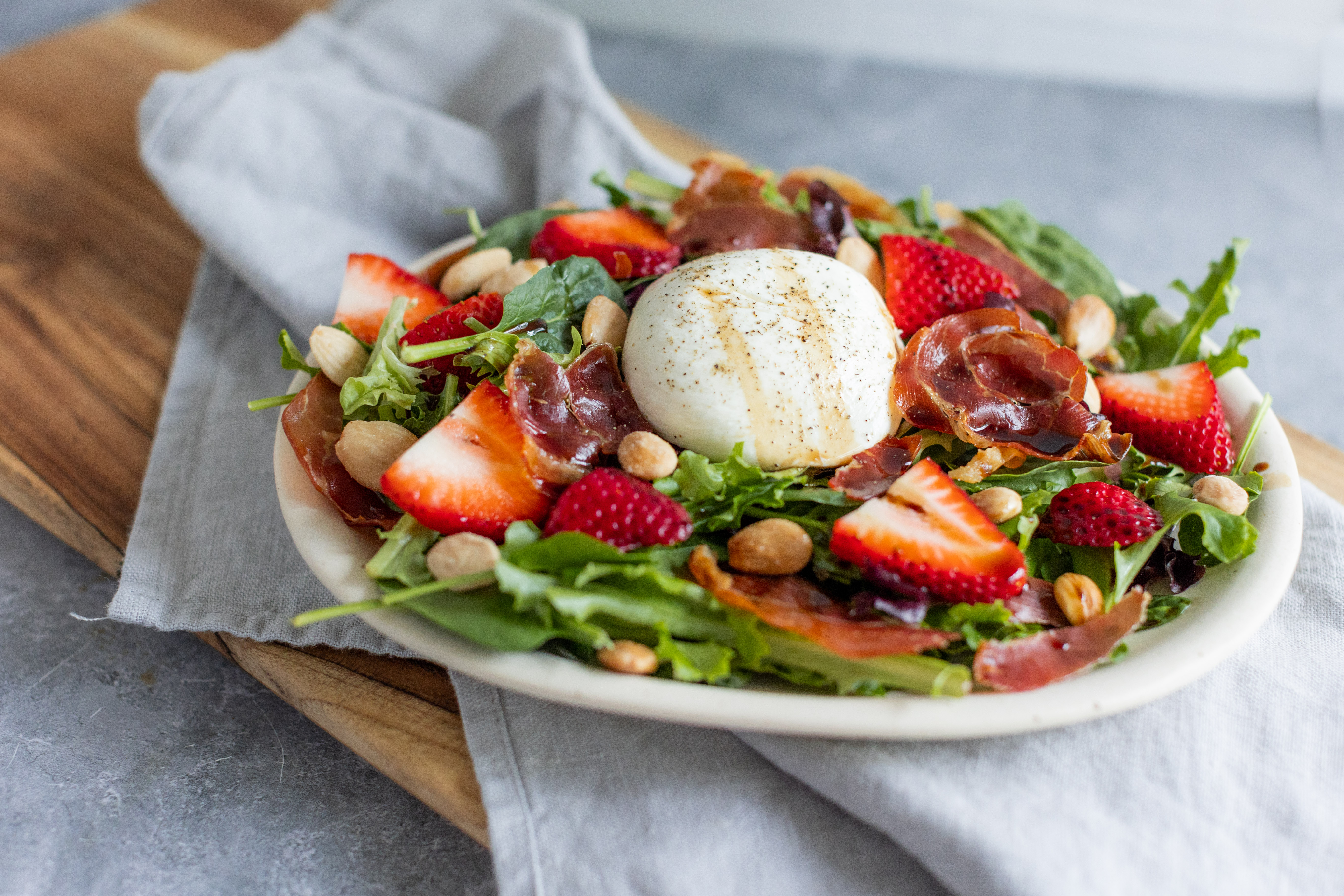 Step 4 -Add the spring mix to a shallow bowl and top with the strawberries, the almonds, the prosciutto crumbles, and the burrata.
