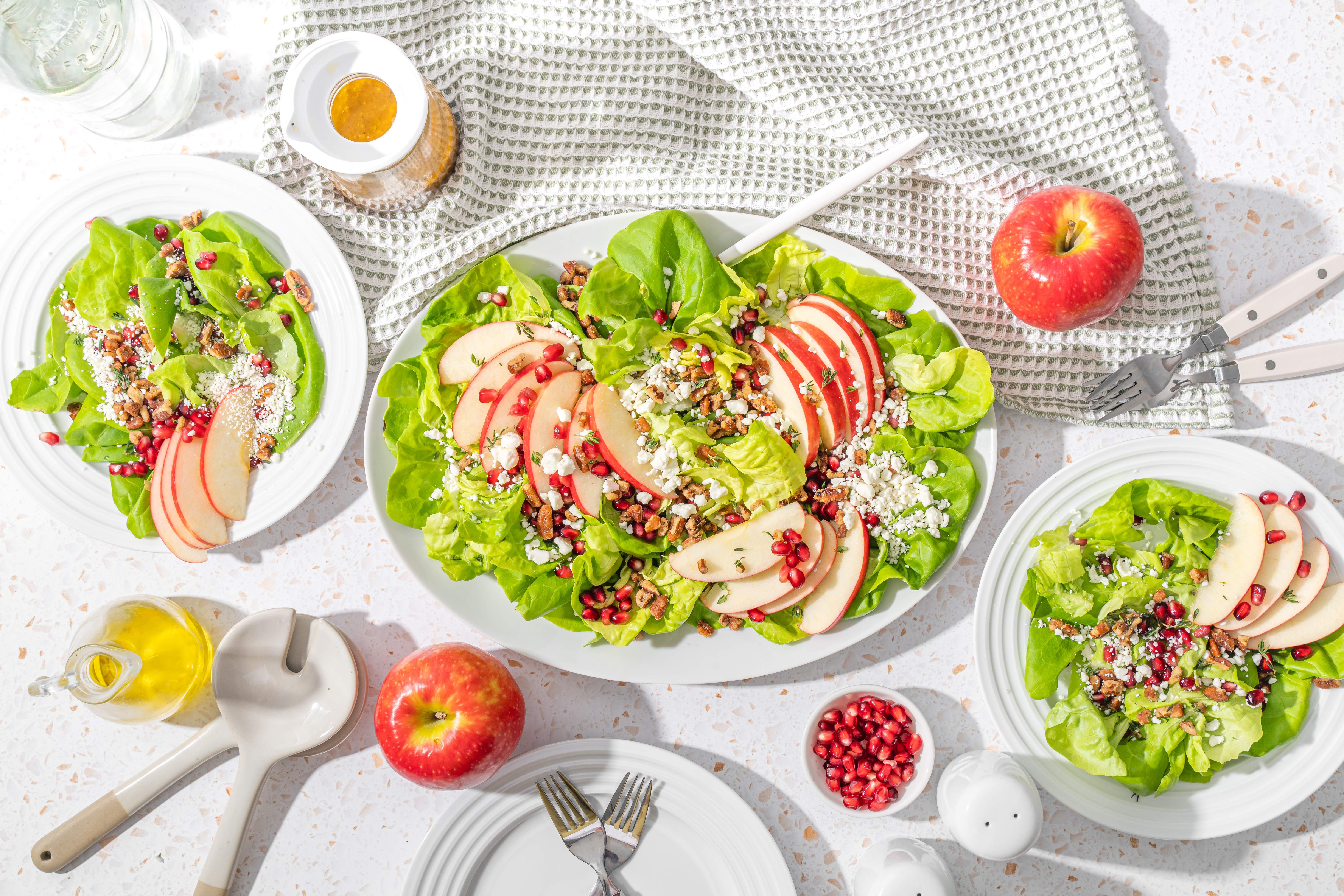 Step 4 -Top the greens with the apple slices, the candied pecans, the goat cheese, and the pomegranate seeds.