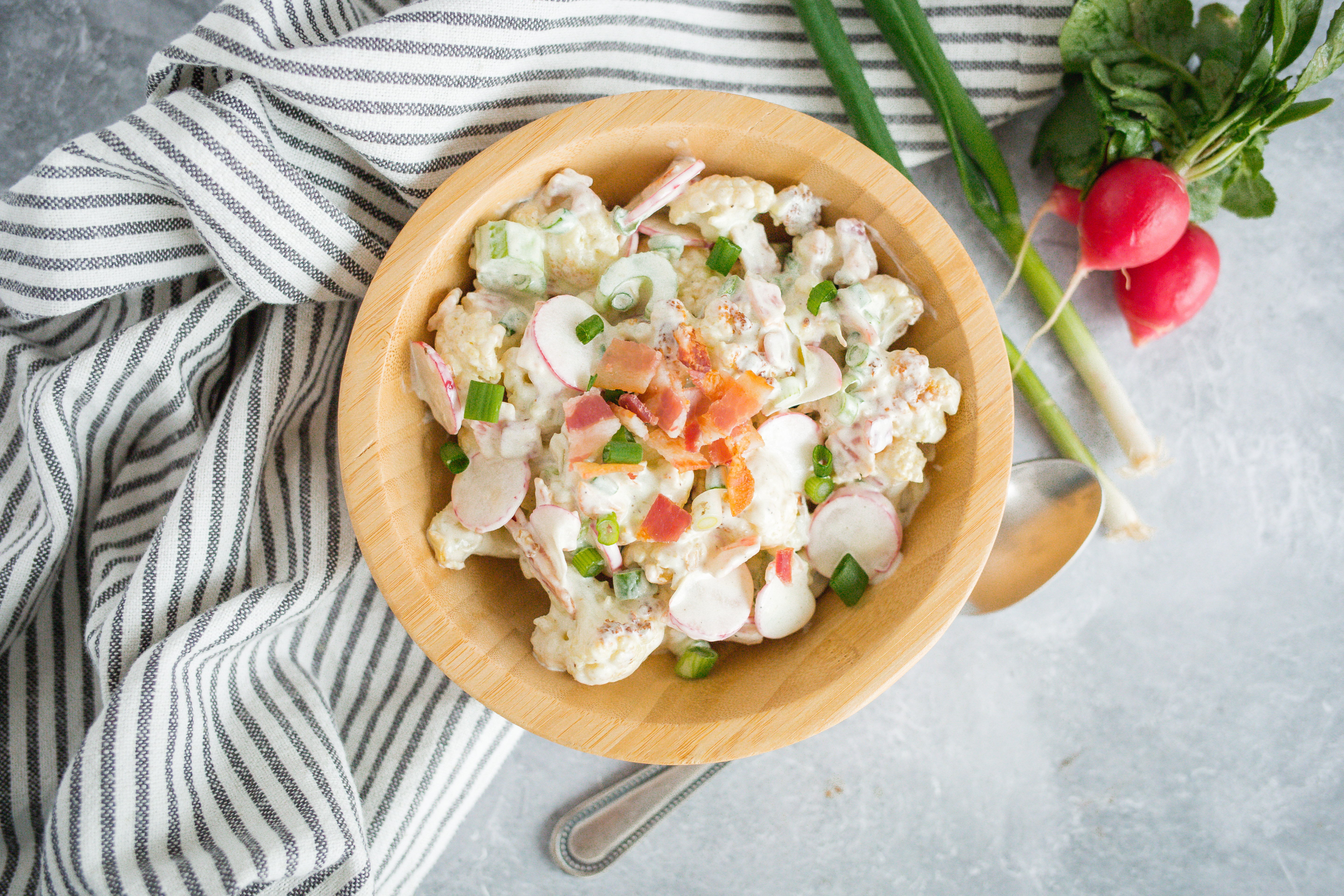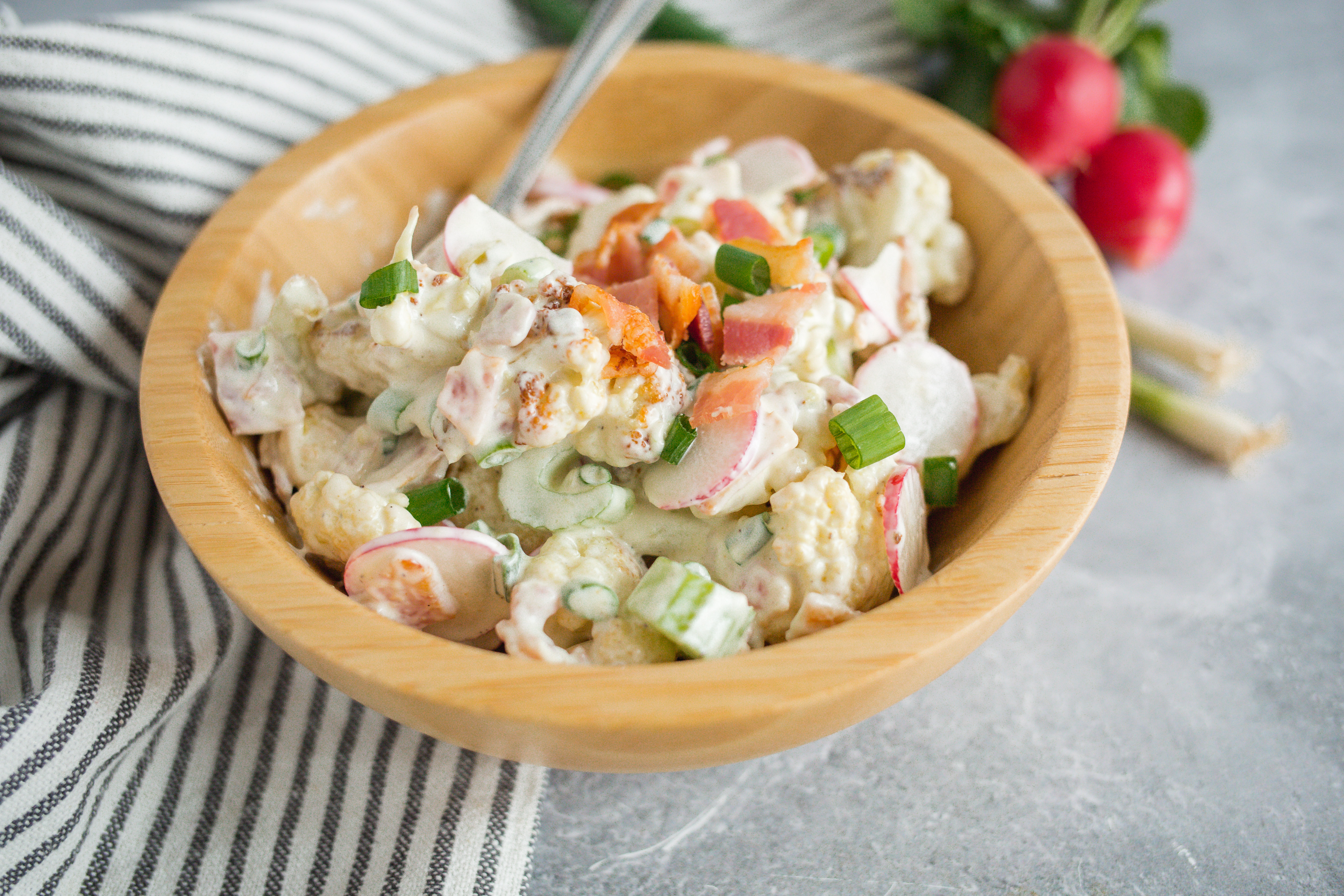 Step 7 -Transfer the cooled cauliflower pieces to a large bowl, add the radish slices, the celery, the sharp cheddar cheese, the sliced green onions, the crumbled bacon, and the dressing mixture, and toss well to coat.