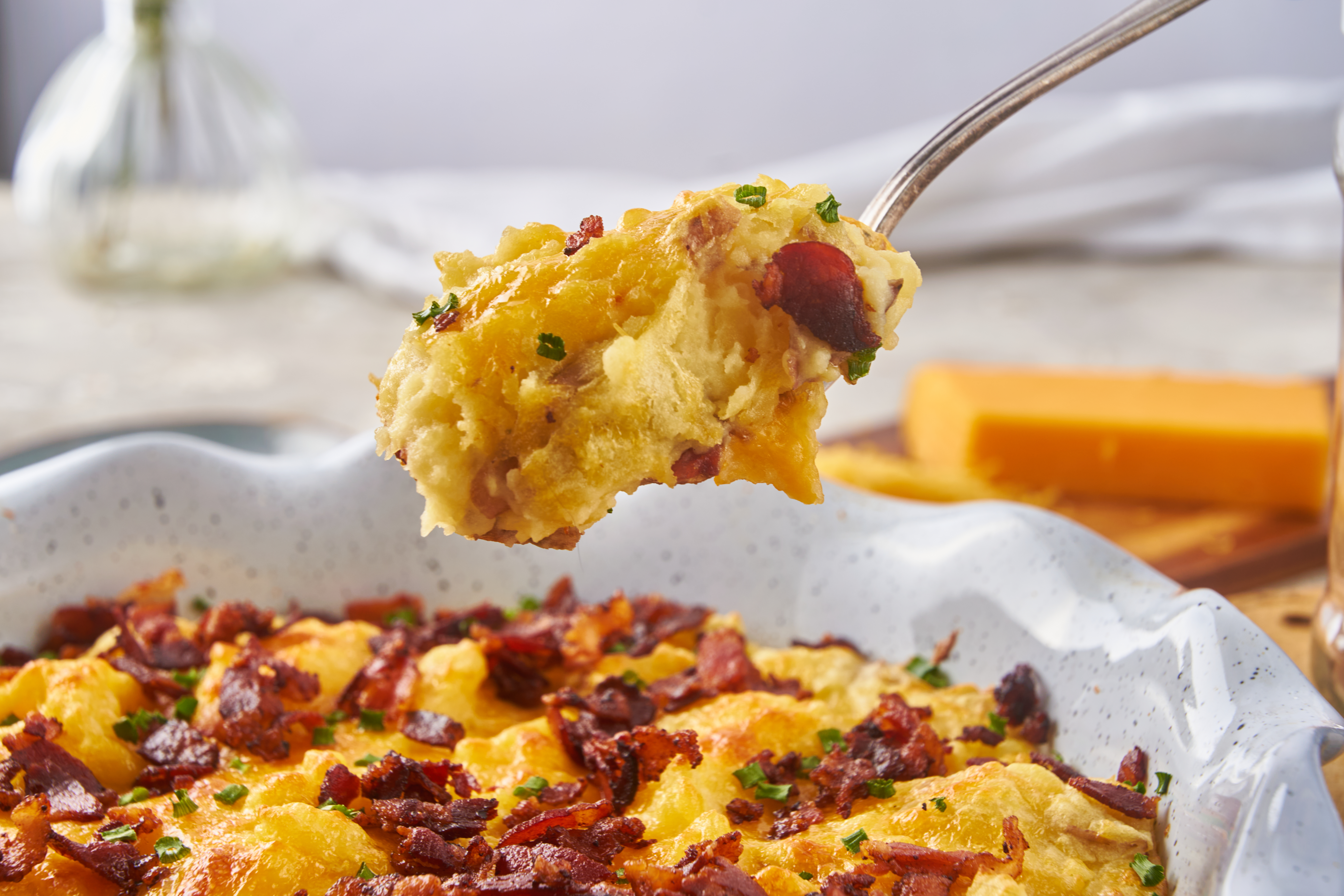 Potatoes are truly the king of comfort food, wouldn't you agree?! They are so versatile and taste so good! This Loaded Red Potato Bake is just another jewel in the crown of potato royalty. The tenderly cooked red potatoes are mashed to perfection and then layered with rich cheddar cheese and creamy sour cream... what is there not to love?! Oh wait, there is more to love! We forgot about the layer of crispy bacon that adds the perfect punch of flavor. How could we forget that?! Yum! Try this Loaded Red Potato Bake the next time a wave of comfort-finding food is needed. Now, who needs a potato hug?
