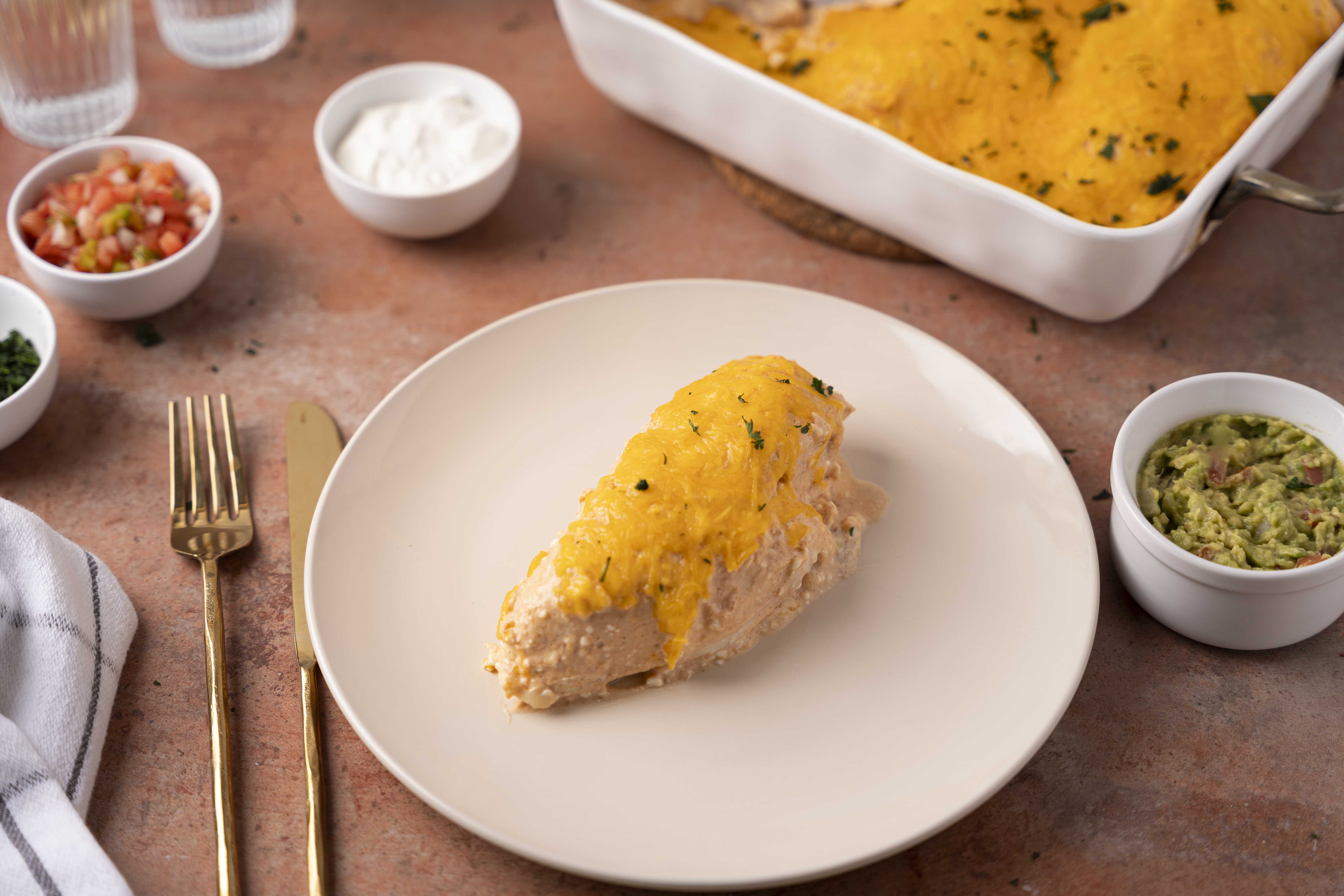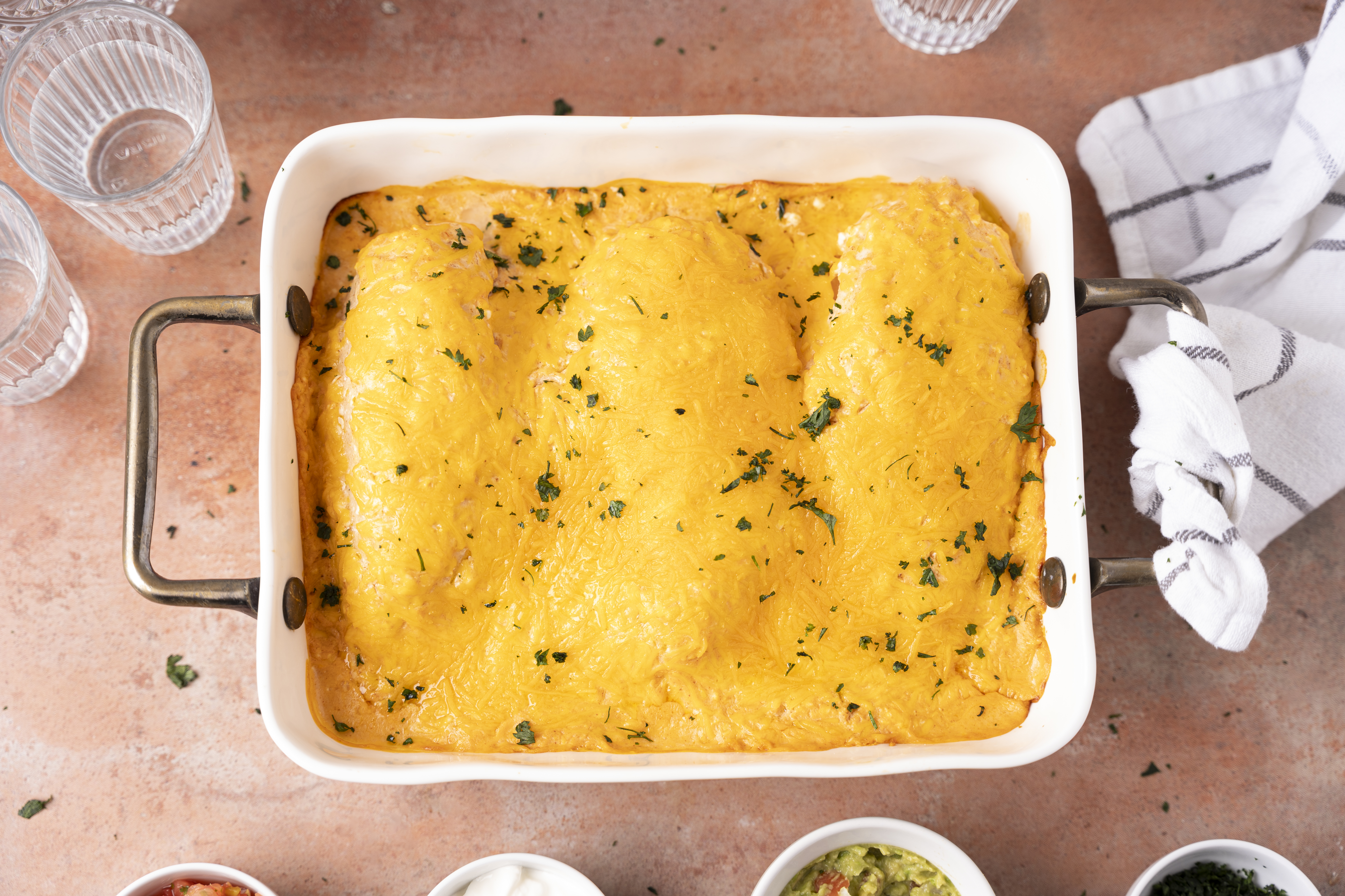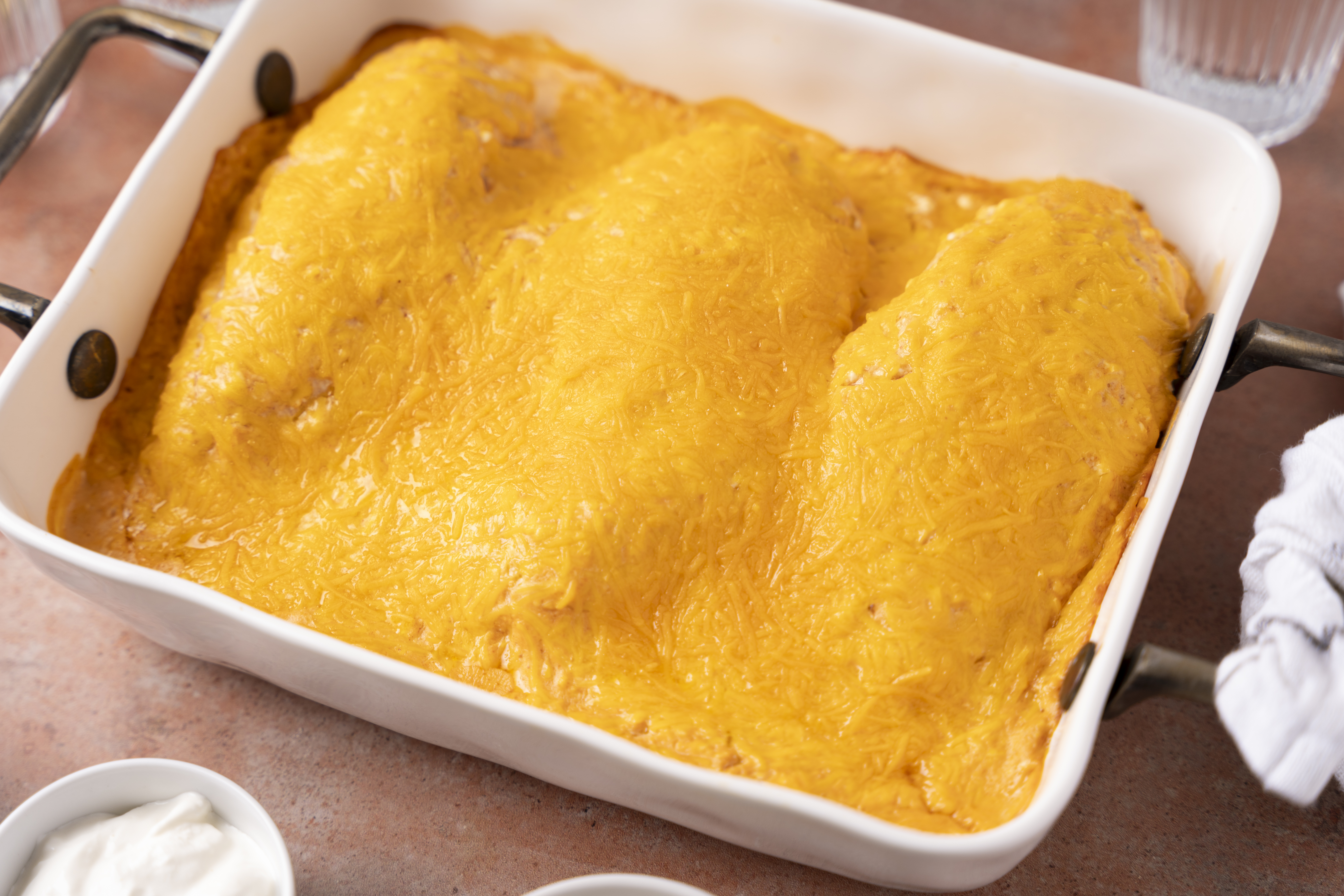 Isn't it lovely that even when you're trying to watch what you eat, there are plenty of Tex-Mex meals ready to fill you up... without putting you behind on your goals?! Low-Carb Chicken Enchilada Casserole is one of those miracle dishes that tastes so good, you never even realize you're missing out on some calories! Loaded with tons of melty cheese, these tender, saucy chicken breasts will make you happier than ever. You'll actually be excited to eat dinner and you'll even get a nice burst of protein, which are both great things! Eating better doesn't have to be boring, and Low-Carb Chicken Enchilada Casserole is delicious proof of that!