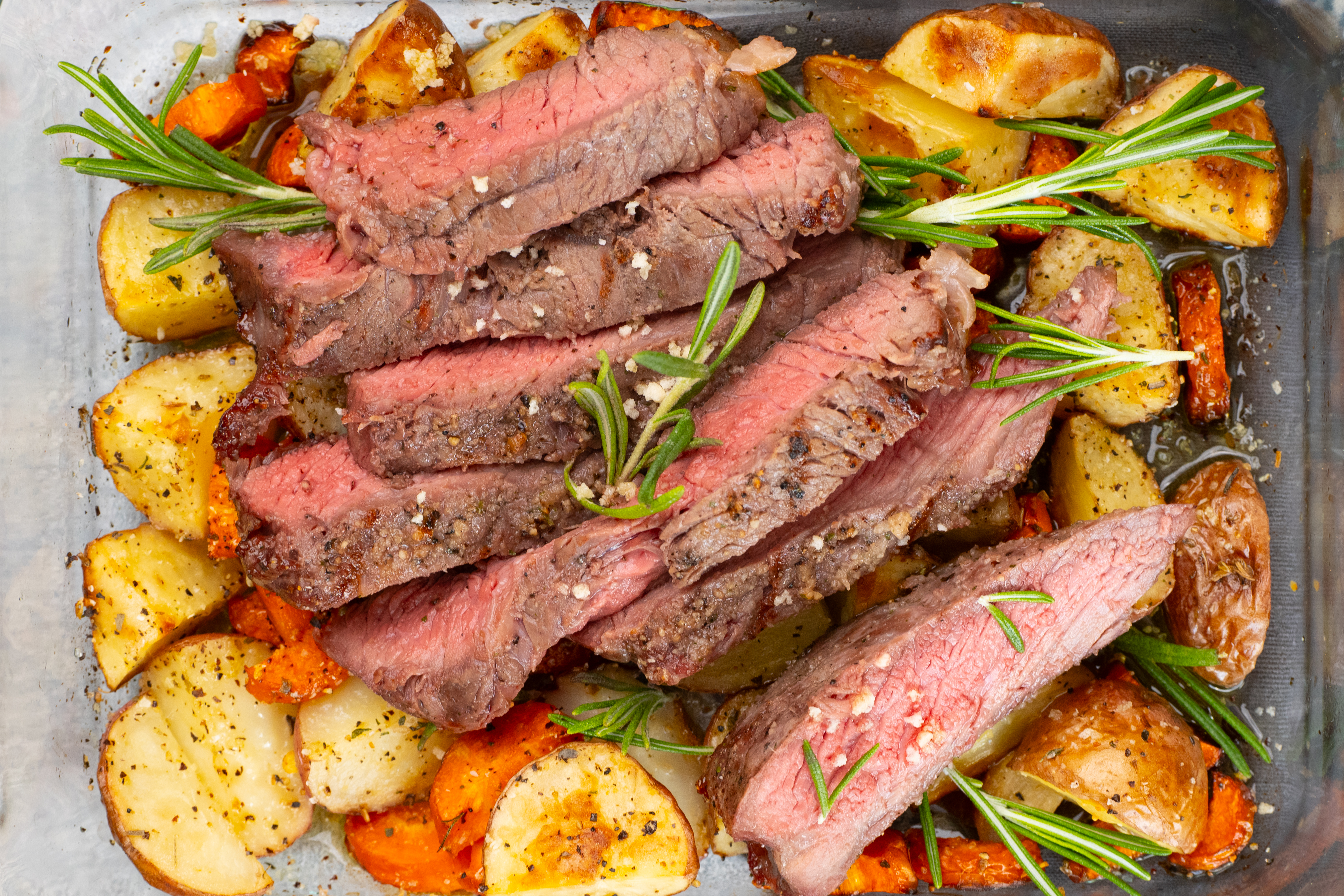 Step 8 -Roast until the potatoes and the carrots are tender and golden, and the steak slices reach an internal temperature of 135 degrees F for medium-rare doneness, about 5 minutes, 145 degrees F for medium doneness, about 6-7 minutes, or 155 degrees F for well done, about 8 minutes.