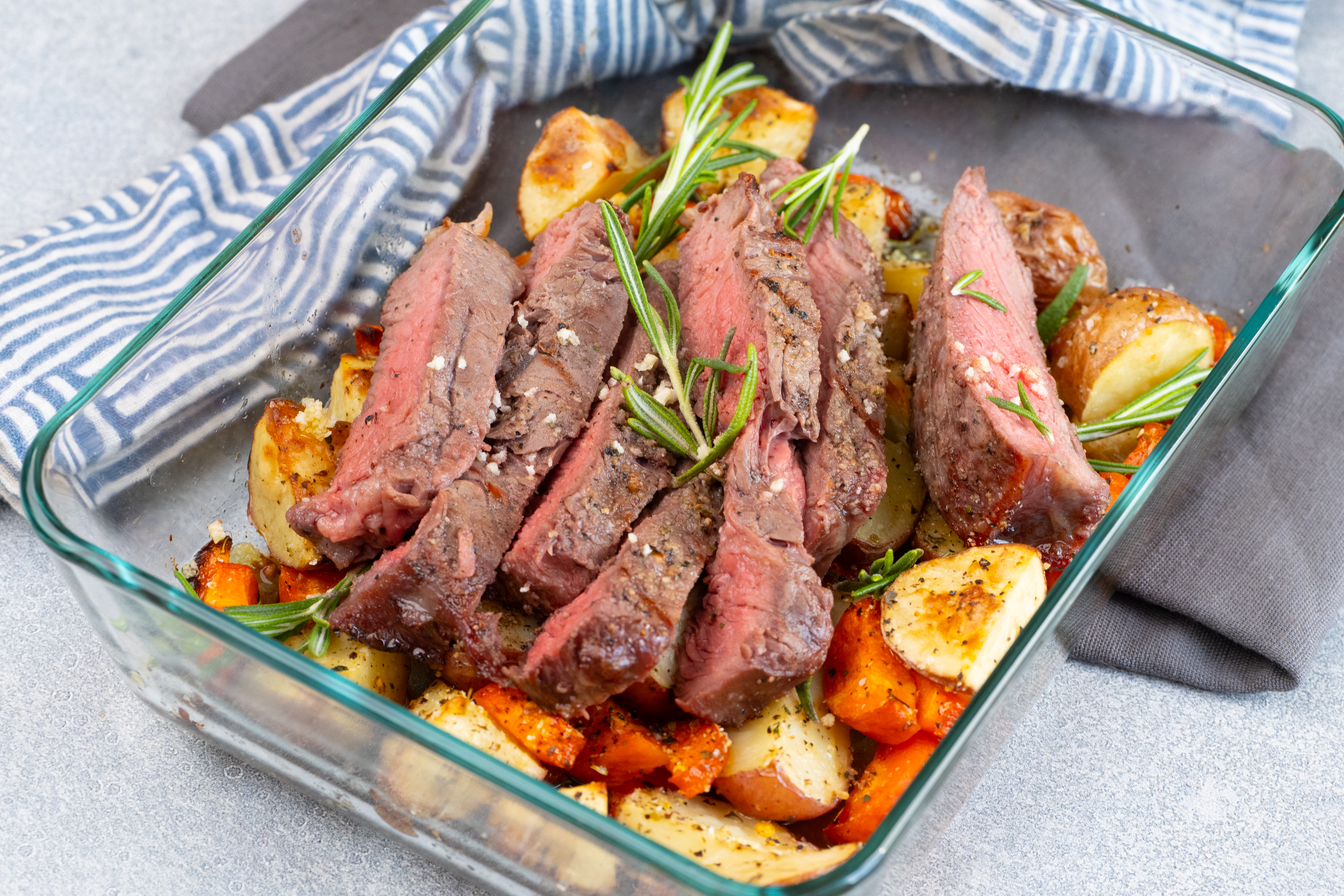 Yes indeed! This is One Great Steak! It's the perfect easy, straightforward, delicious meal for just yourself — it's the best way to enjoy a night off, all to yourself! In just over half an hour, you'll find your plate piled high with tender roasted vegetables and potatoes, and of course a succulent, rosy, juicy steak that is just packed with beef flavor! Luxury has never felt so accessible than with this One Great Steak!
