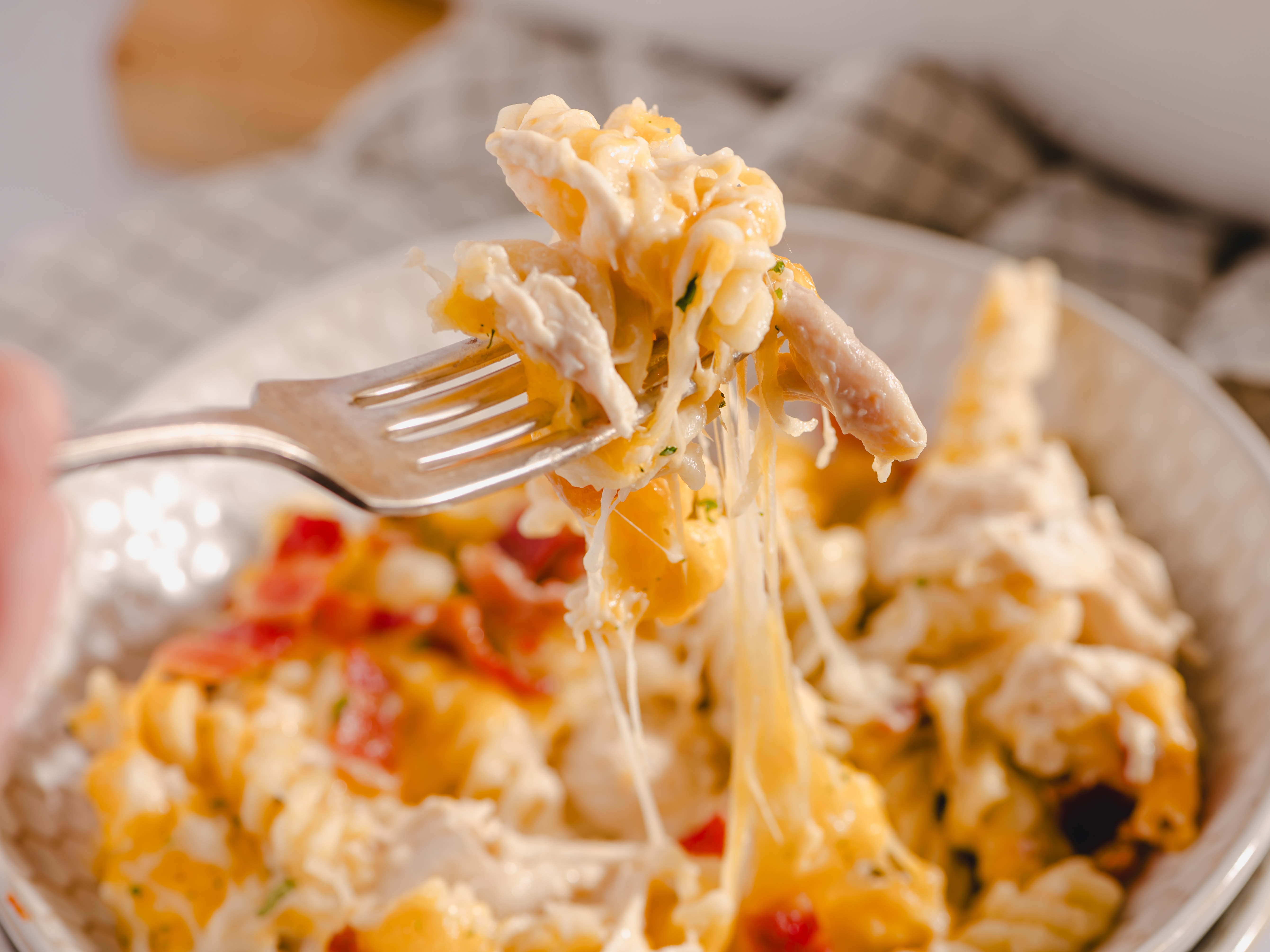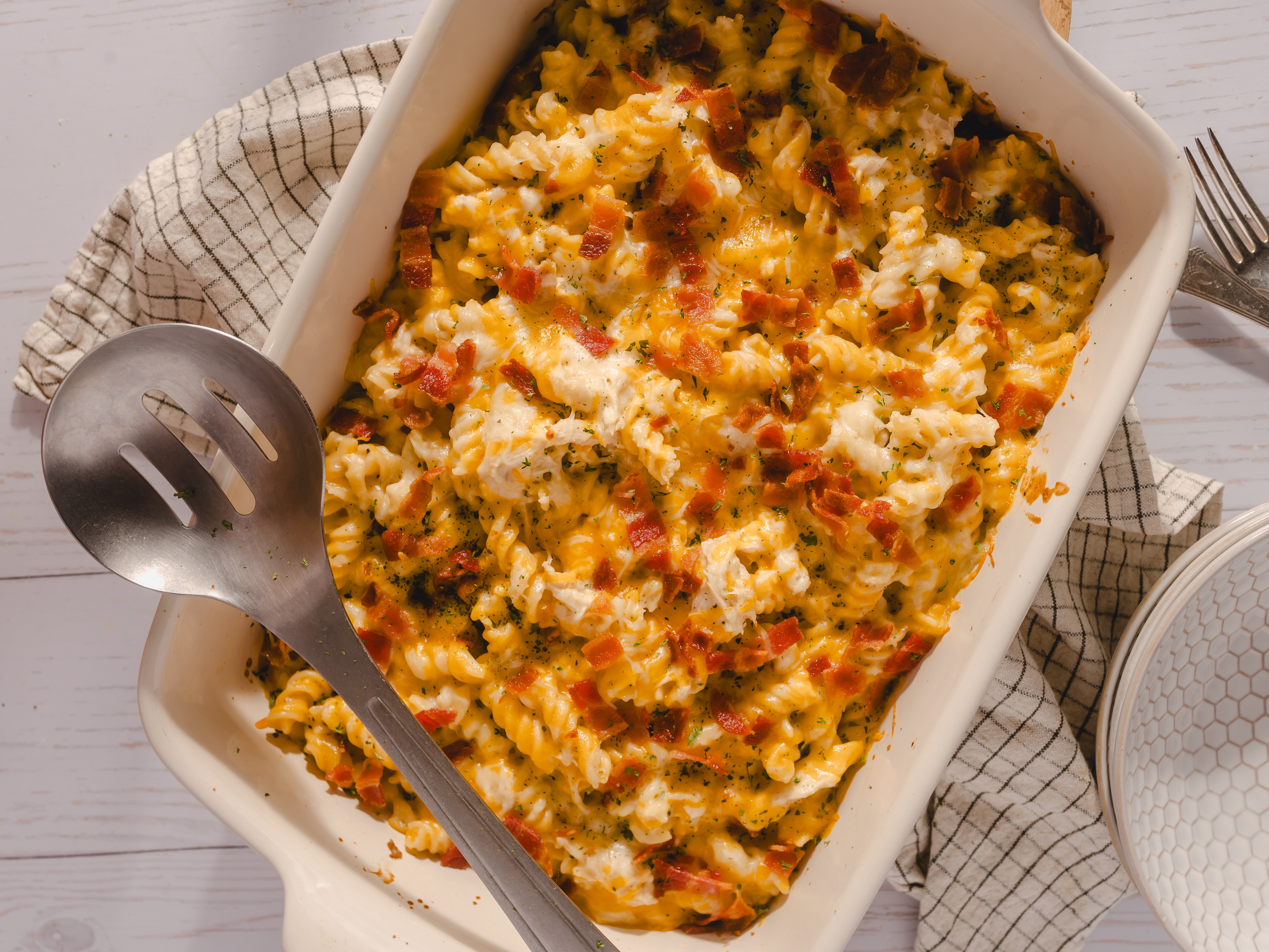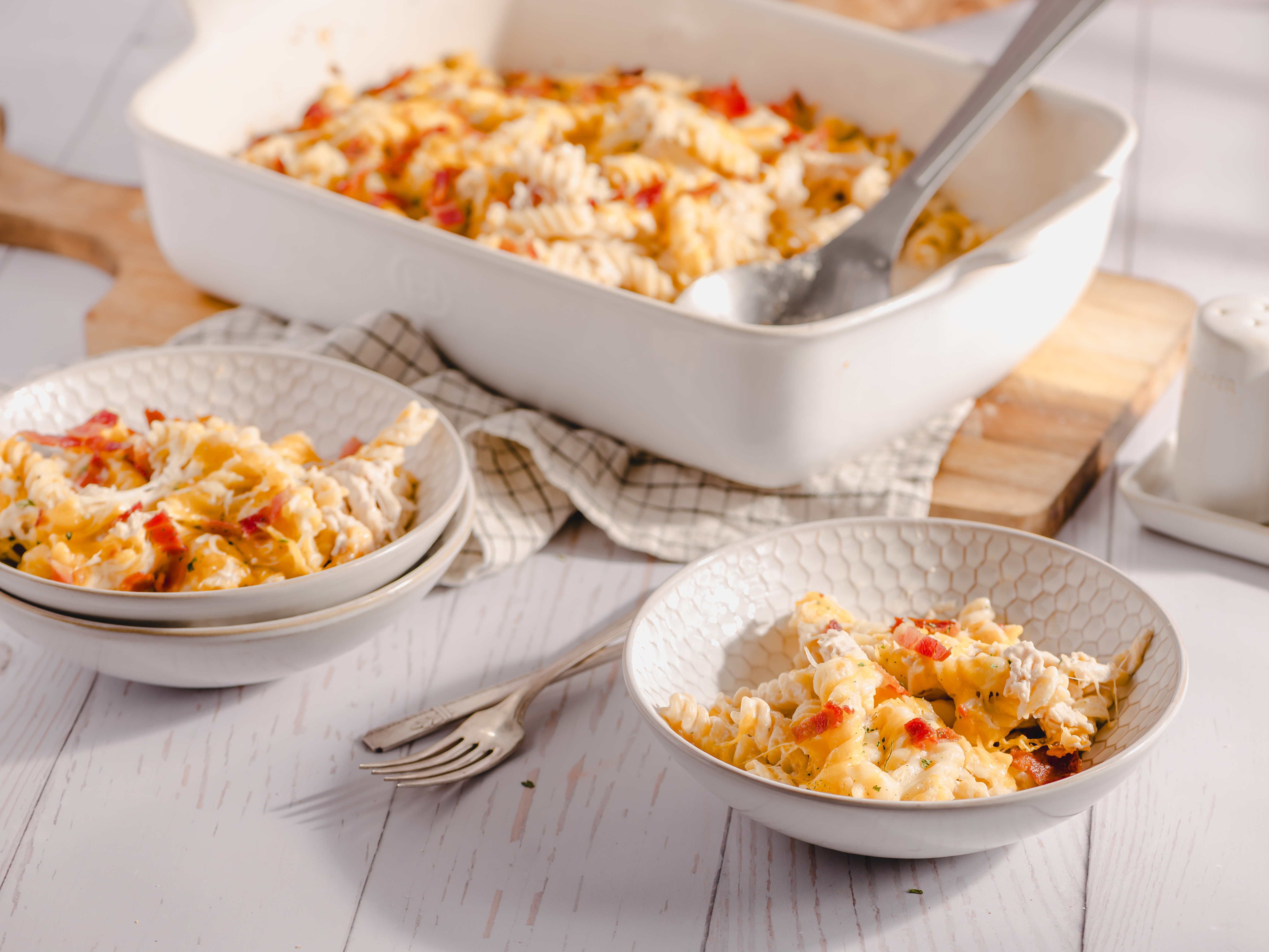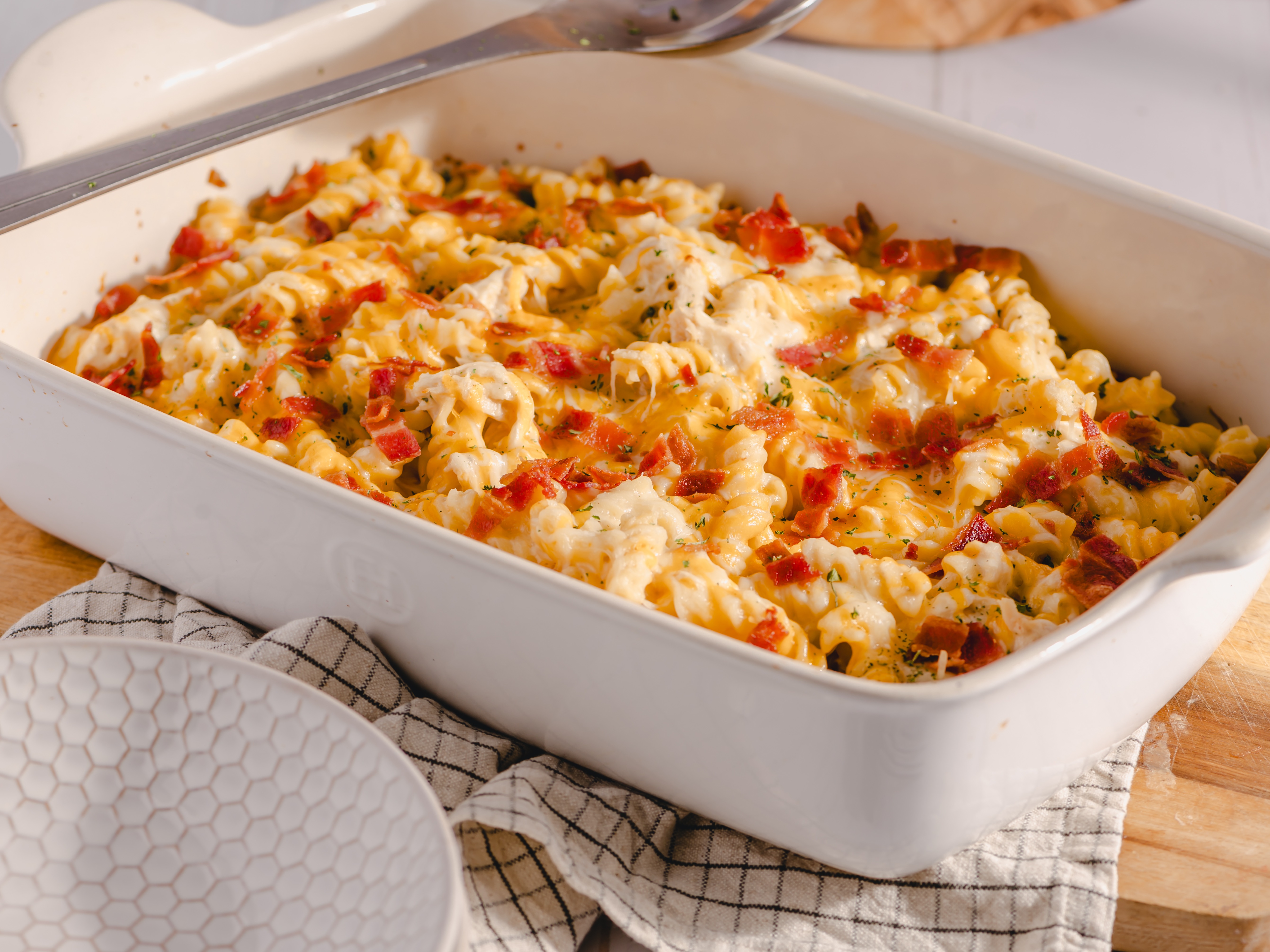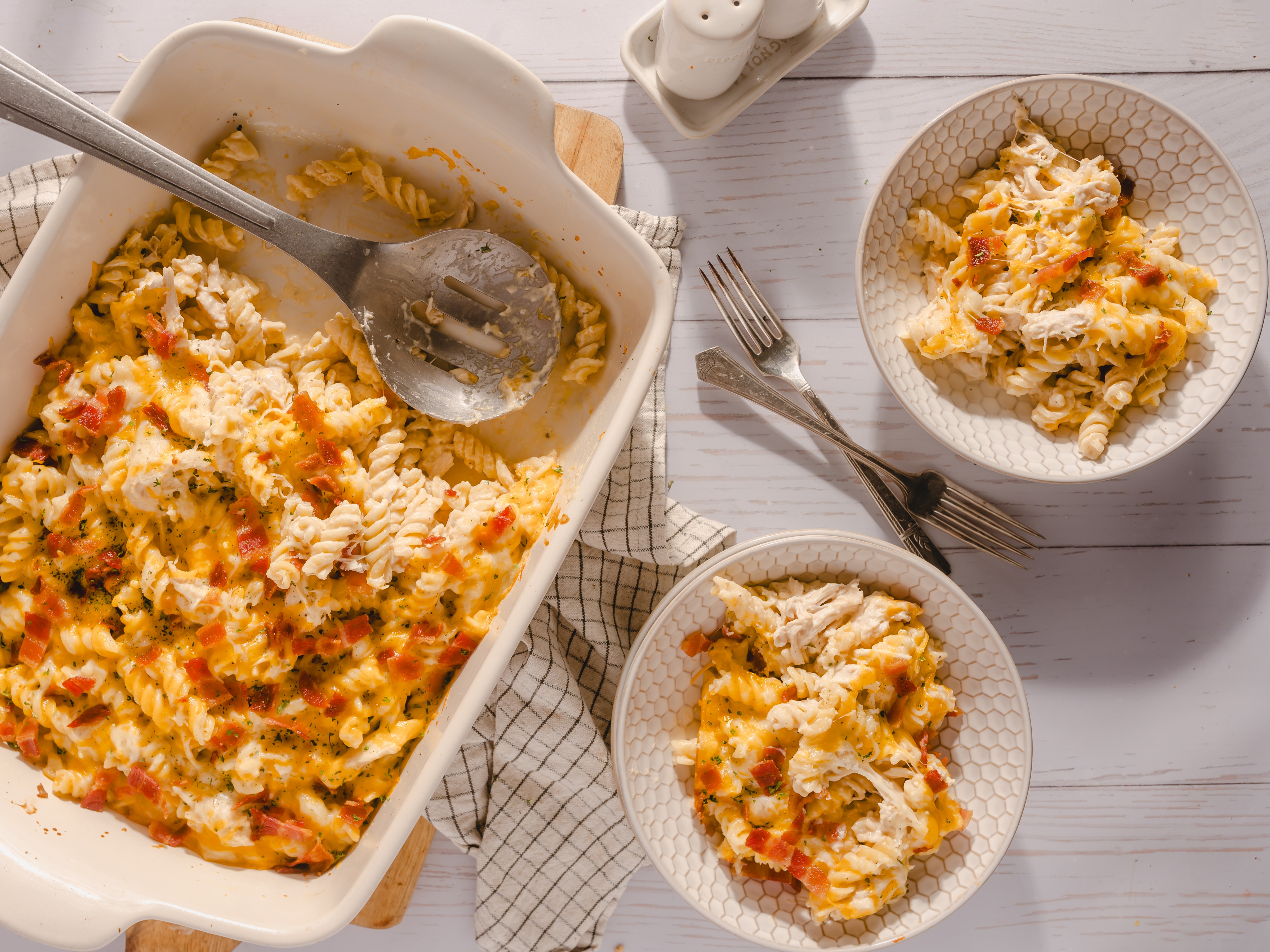 When you're in the mood for a burst of flavor but don't feel like putting in a ton of cooking effort, you must make the Rotisserie CBR Bake! All you do is literally dump the bouncy rotini, juicy rotisserie chicken, creamy Alfredo, and tangy ranch in a bowl and toss to coat. Spread that all in your favorite baking dish, layer it with loads of (soon-to-be) melty cheese, and after a little time in the oven, you've got the perfect, easy dish for dinner! Rotisserie CBR Bake will be a huge hit, no doubt about it!