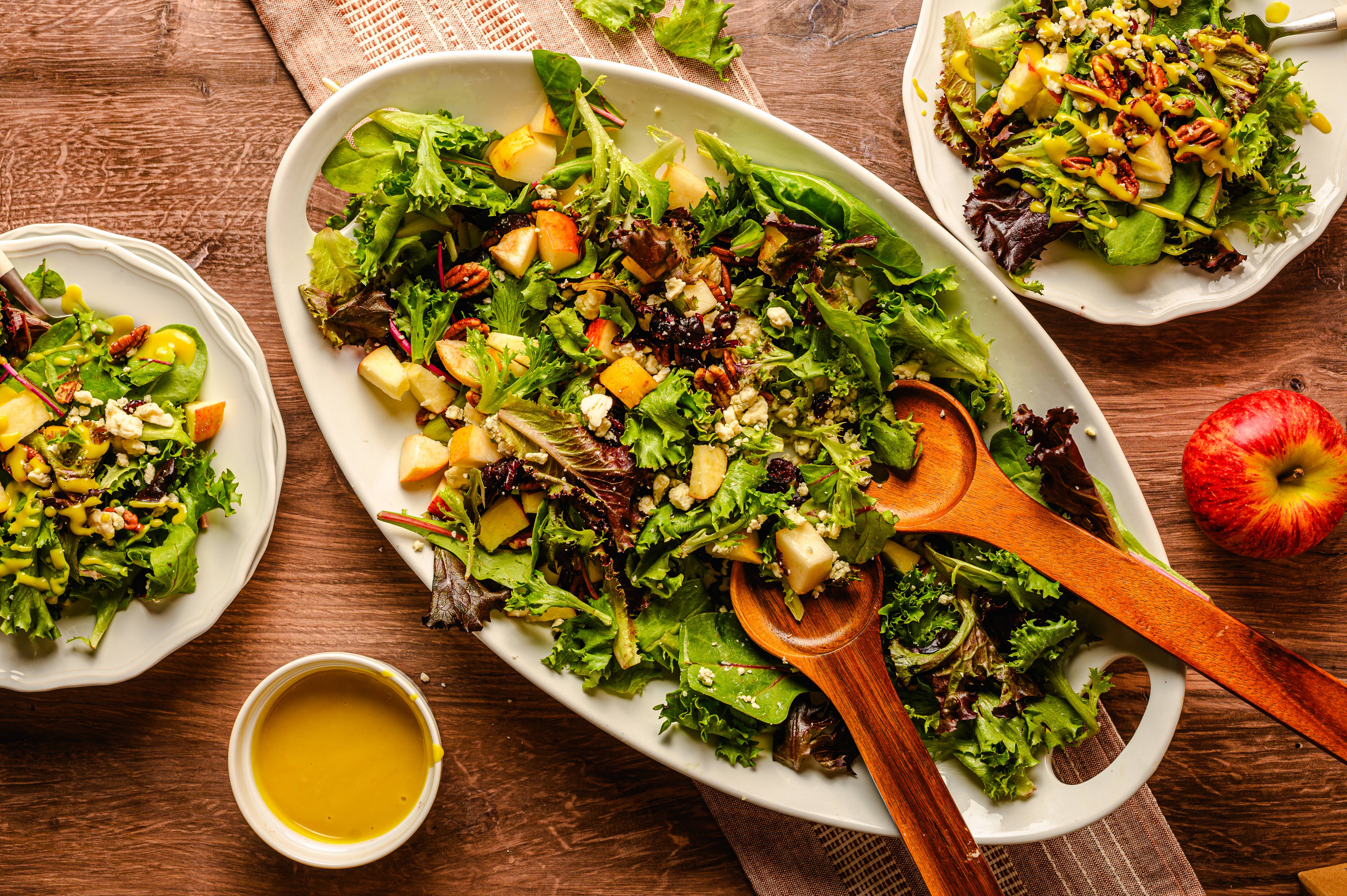 Food can bring numerous feelings to a person, and some more than others. Thankful-for-You Salad gives all the comforting feelings of good food with great taste. Homestyle honey mustard dressing wraps its fabulous flavors around mixed greens, crunchy apples, sweet pears, tart craisins, tangy blue cheese, and salted pecans for a wonderful combination of just the right amount of sweetness, tartness, and crunchiness. All the good feelings are found in this Thankful-for-You Salad, as you enjoy it as a main meal or as a delicious side salad. Always give thanks for a good meal well-served!