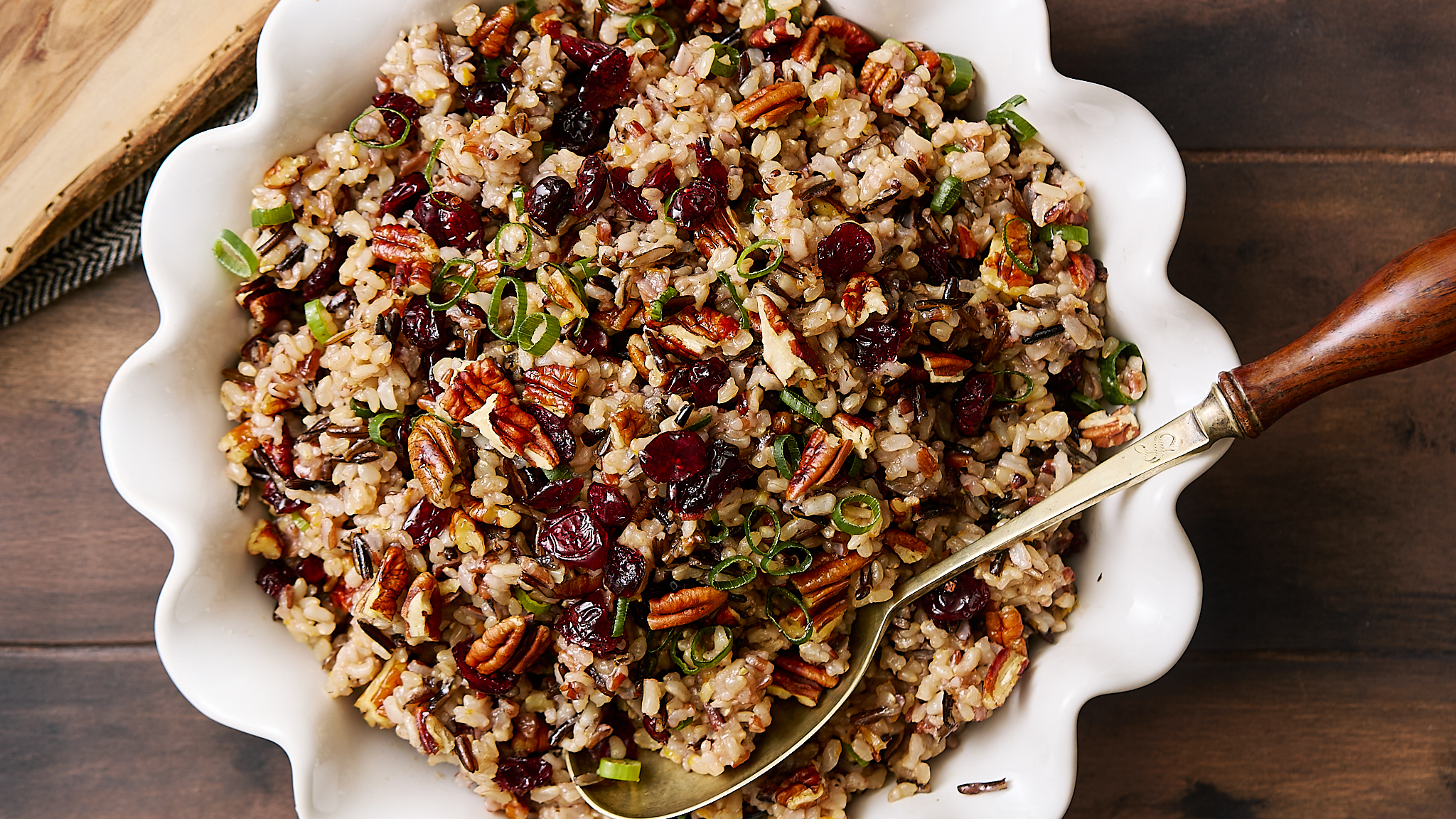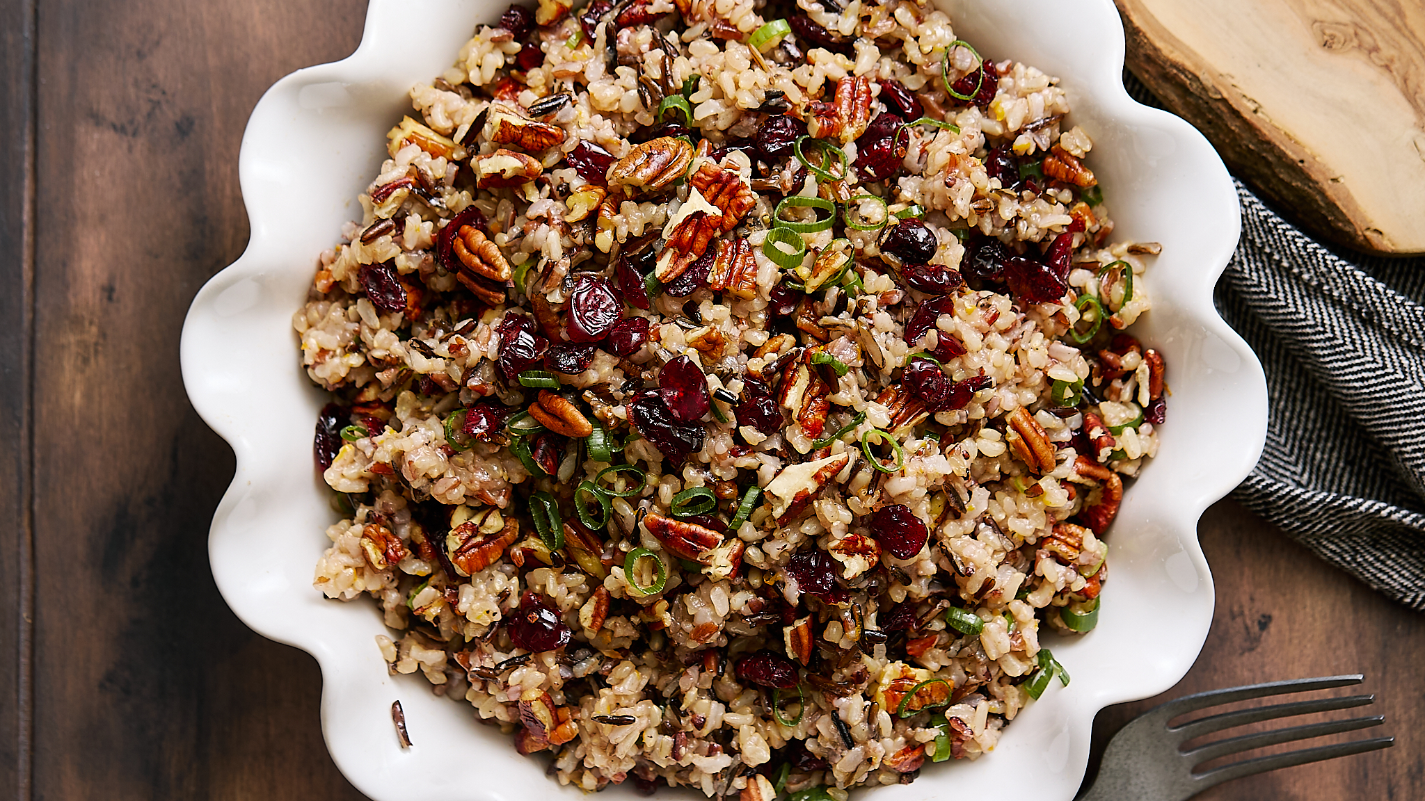Celebrate your favorite fall holiday with this refreshing Thanksgiving Harvest Rice Salad for a festive fireworks display for your taste buds. Packed with tart cranberries, crunchy pecans, and zesty green onions, this dish pairs perfectly with its light and sunny citrus dressing. Using a nutty brown rice and wild rice mix, Thanksgiving Harvest Rice Salad brings vibrant colors and flavors to your holiday table, with colors just like the falling leaves outside!