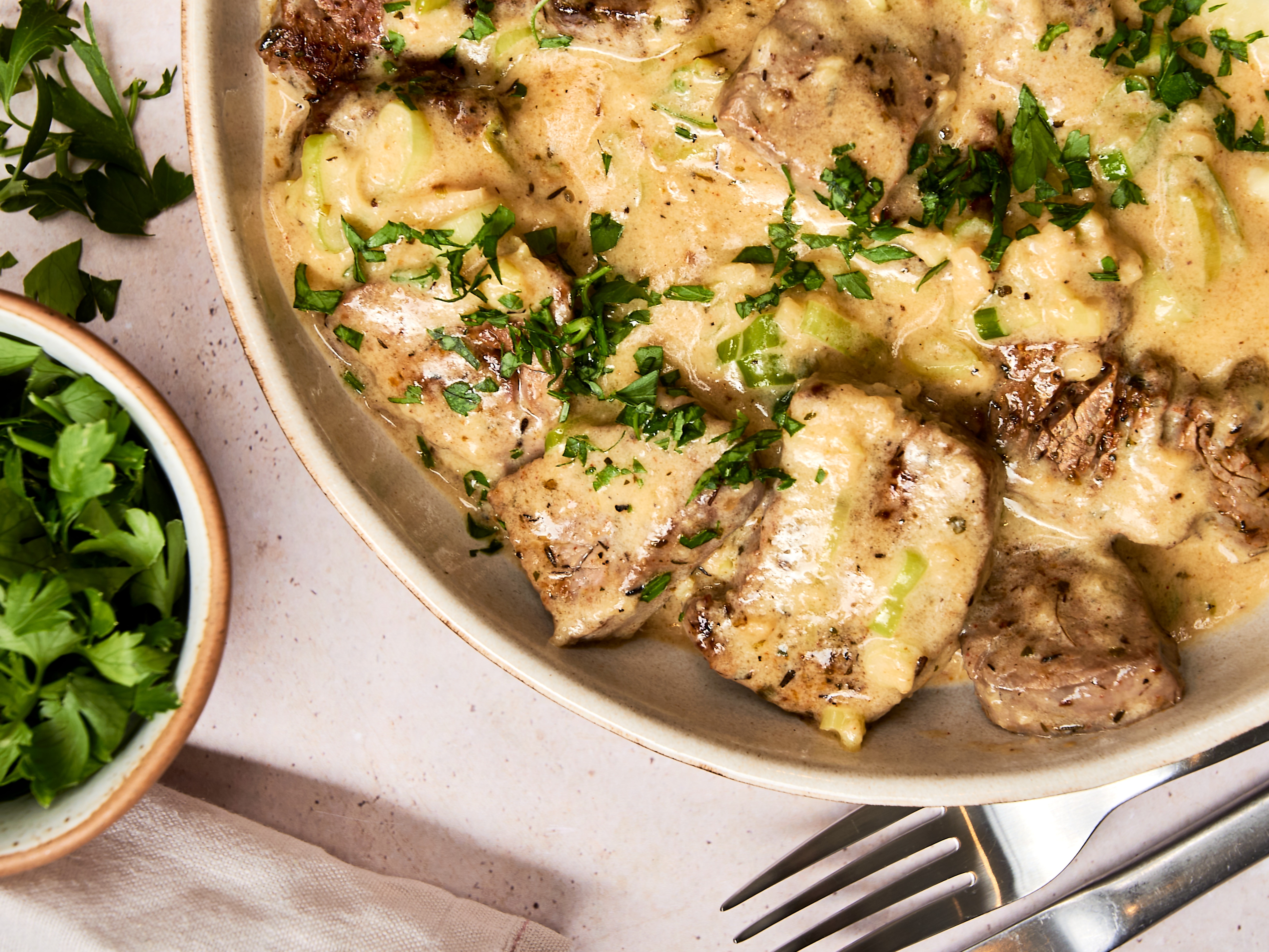 Step 11 -Reduce the heat to low and cook until the steak pieces reach an internal temperature of 135 degrees F for medium-rare doneness, about 1 minute.