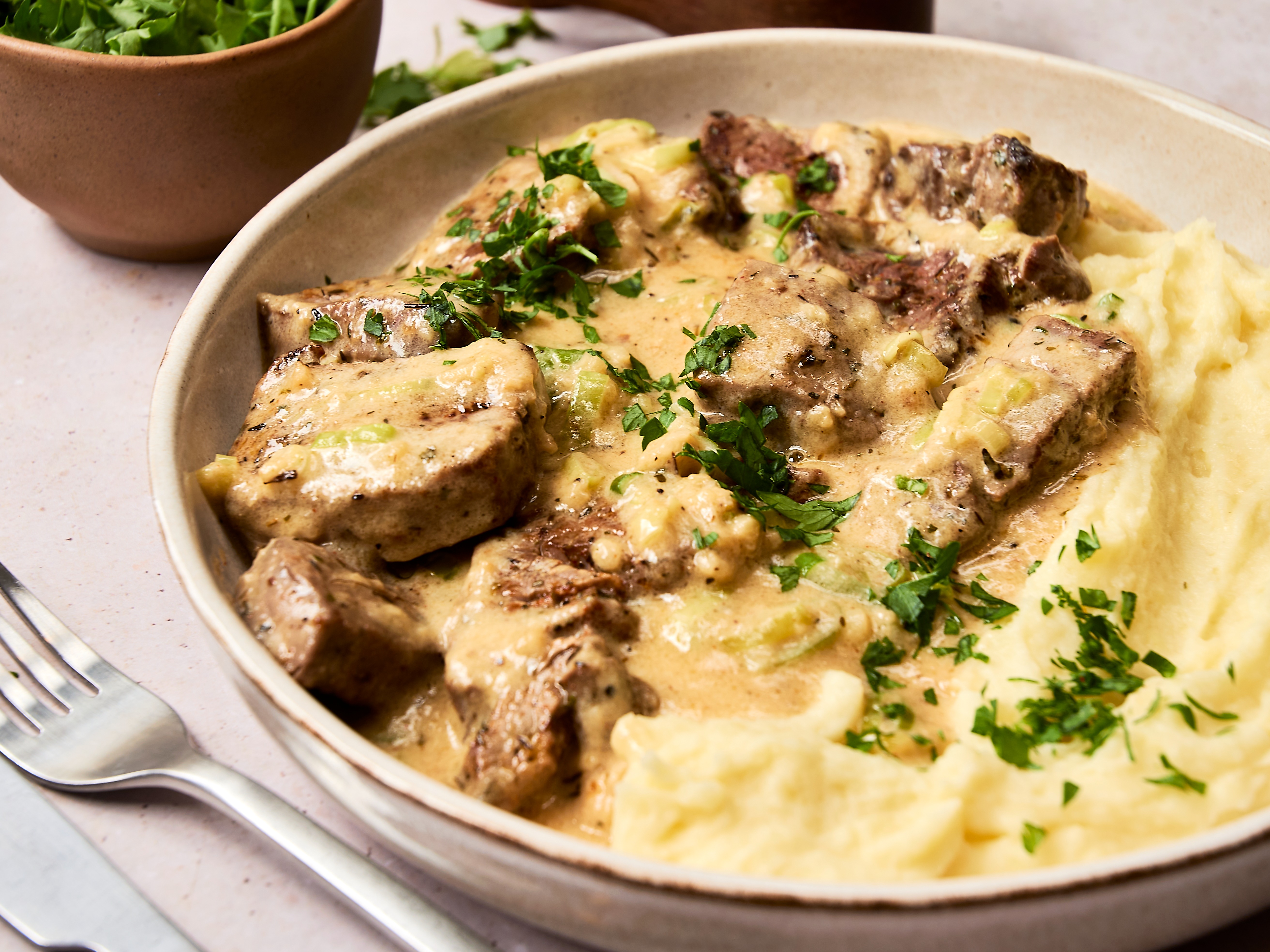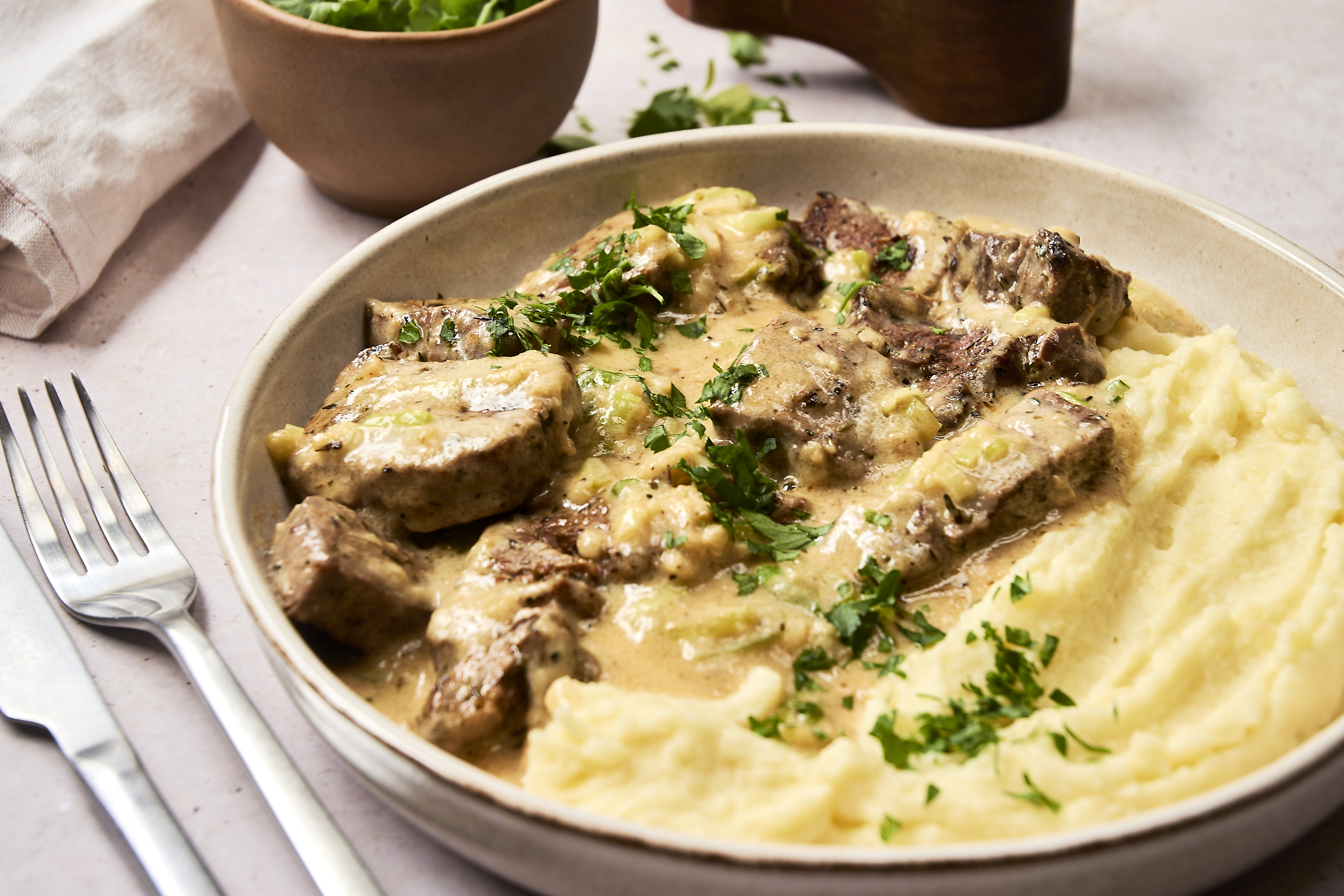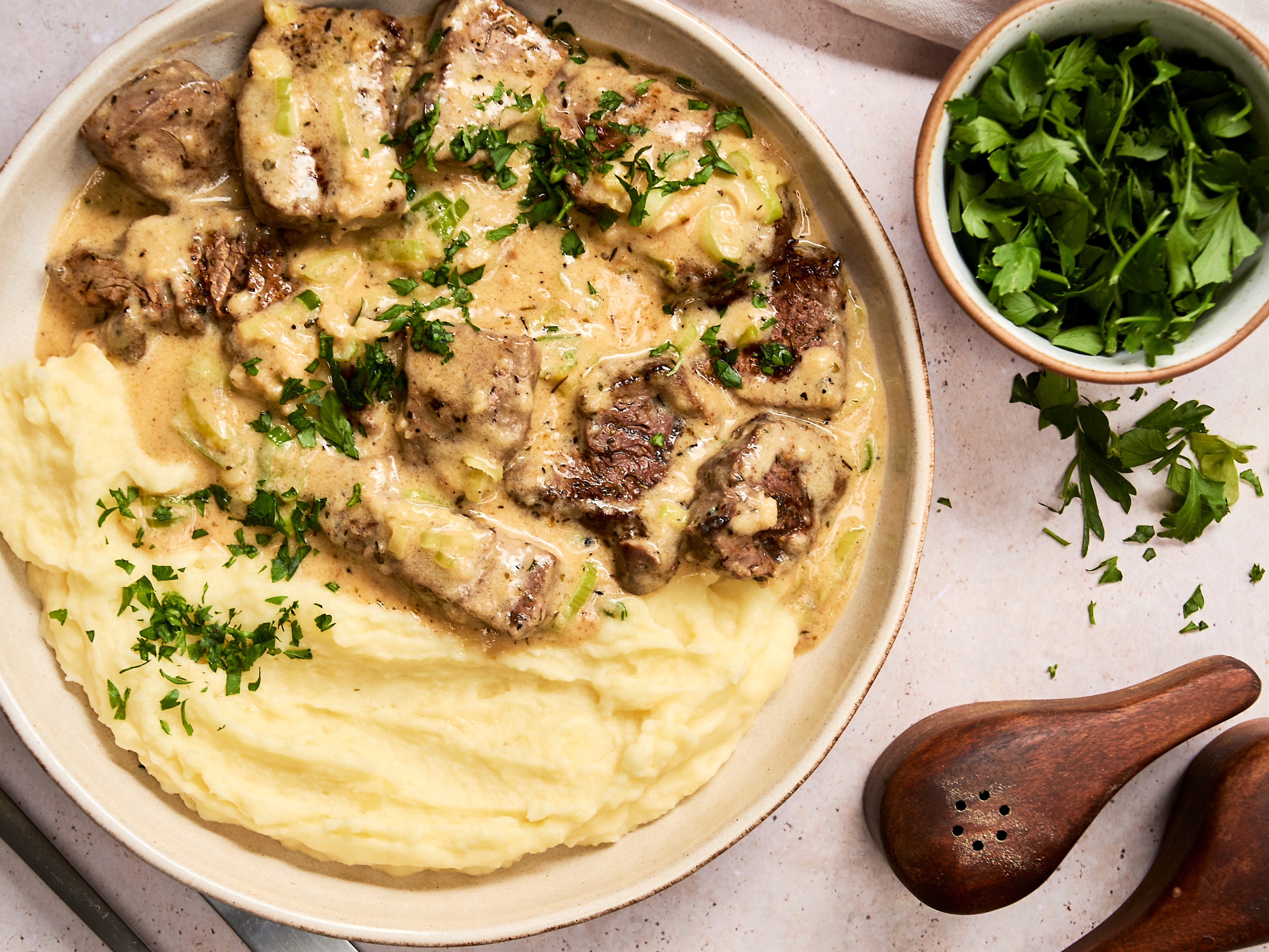 Step 25 -Scoop even portions of the mashed potatoes onto serving plates and evenly top with the steak bites and the parmesan cream sauce.