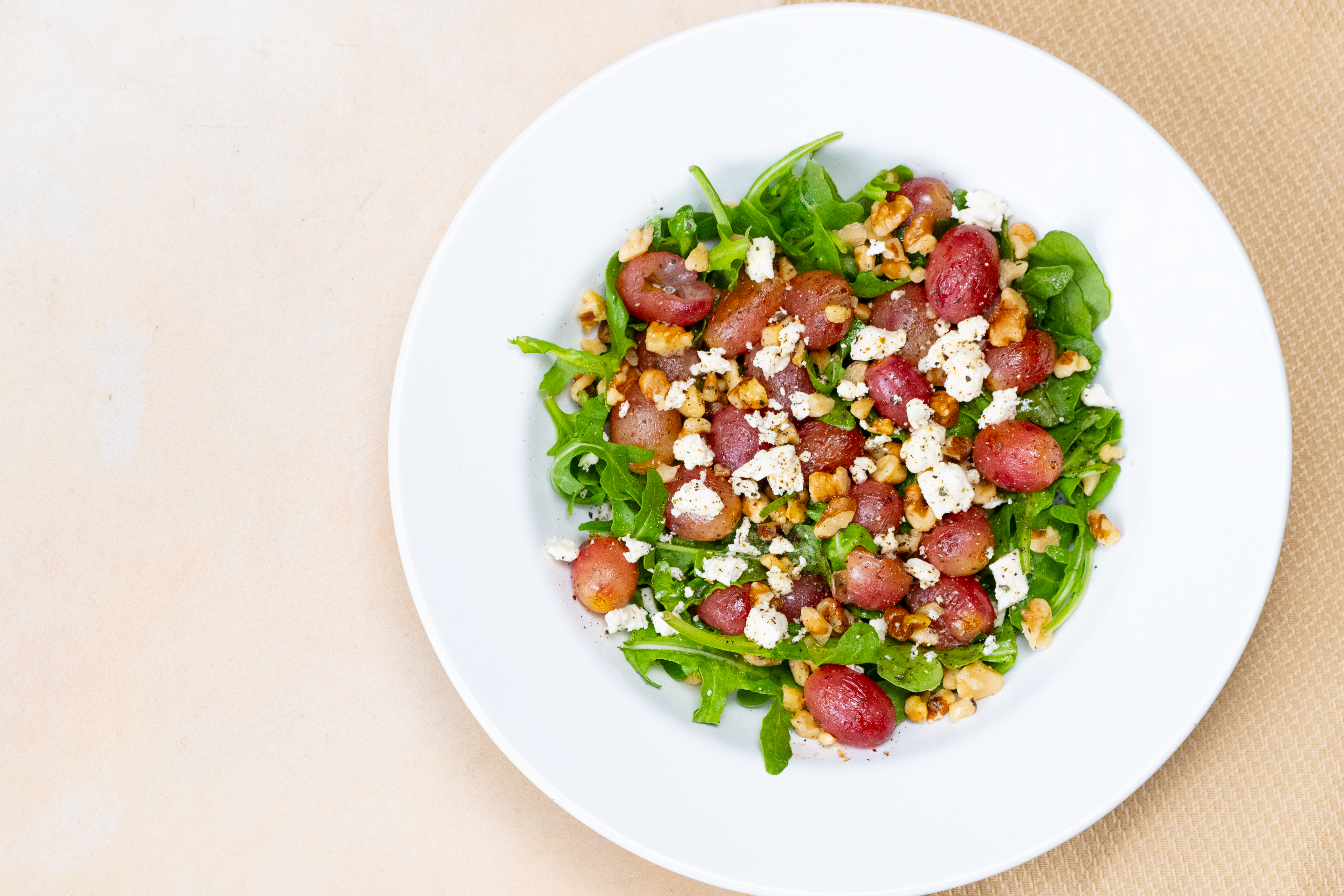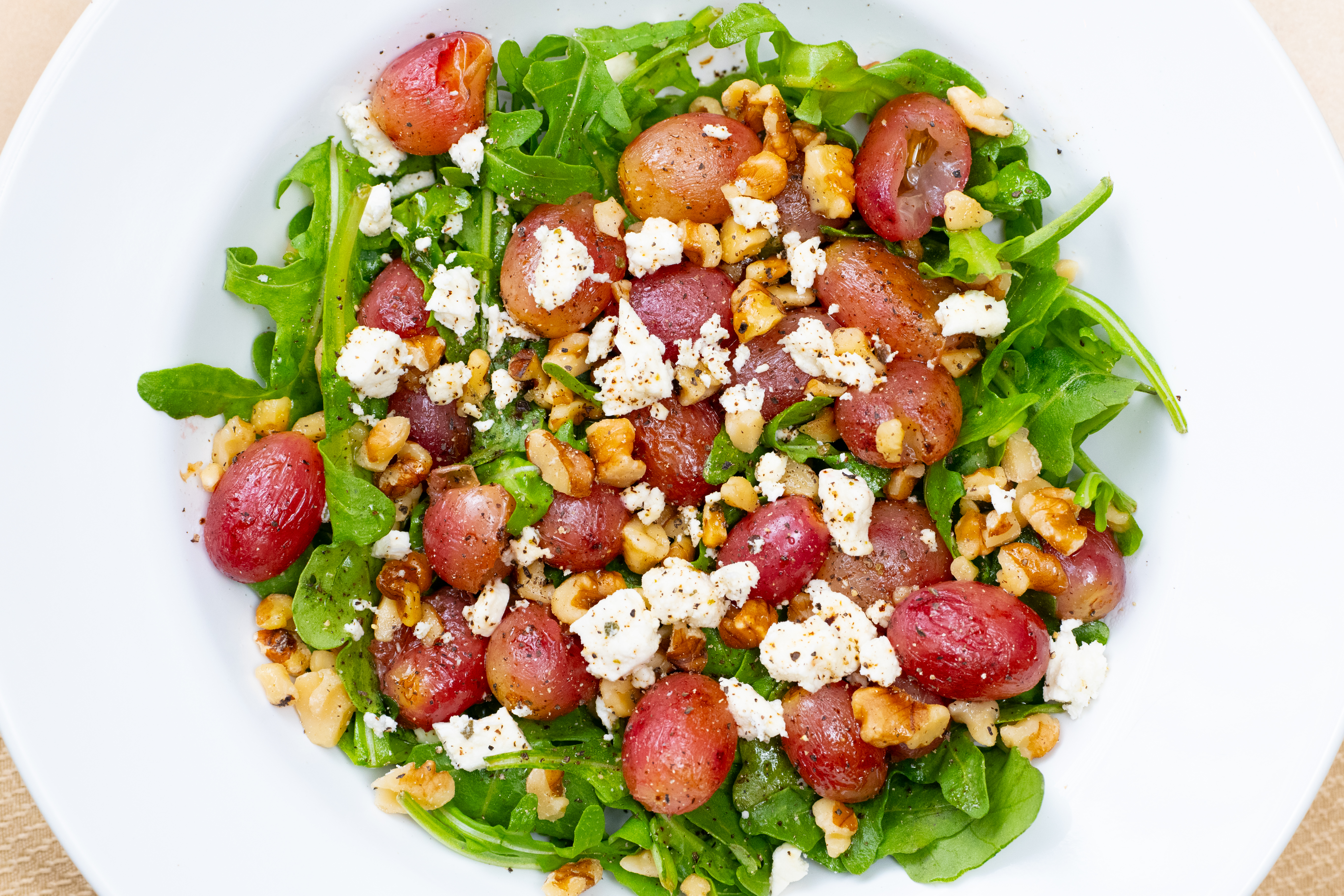 Sometimes you just need a salad that's a little unusual and all yours. Uniquely-Yours Salad is a personal-sized bowl full of exceptionally fresh flavors made just for you. A base of bright arugula gets sprinkled with creamy blue cheese, roasted grapes (yup you read that right!), and crunchy walnuts to provide a creative combination you've probably never tried before. Drizzled with a nice, lemony dressing, this Uniquely-Yours Salad is a rarity you'll be craving on the regular!